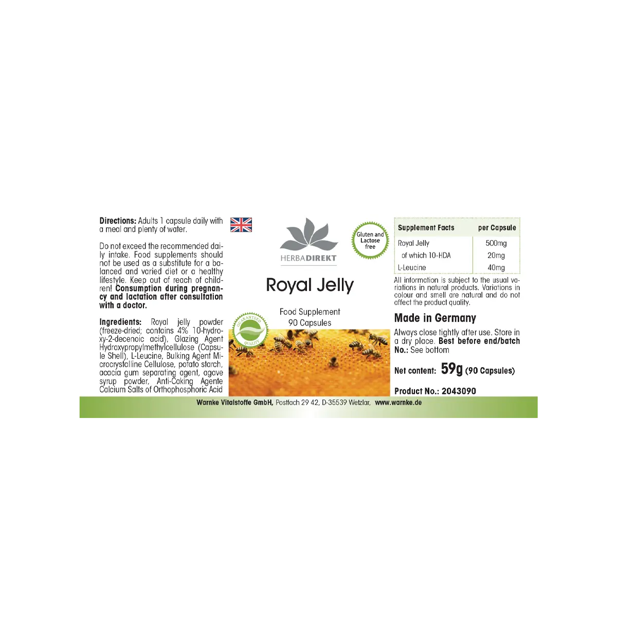 Gelée Royale Pulver (gefriergetrocknet; enthält 4% 10-Hydroxy-2-Decensäure), Überzugsmittel Hydroxypropylmethylcellulose (Kapselhülle), L-Leucin, Füllstoff mikrokristalline Cellulose, Kartoffelstärke, Trennmittel Akaziengummi, Agavendicksaft Pulver, Trennmittel Calciumsalze der Orthophosphorsäure
