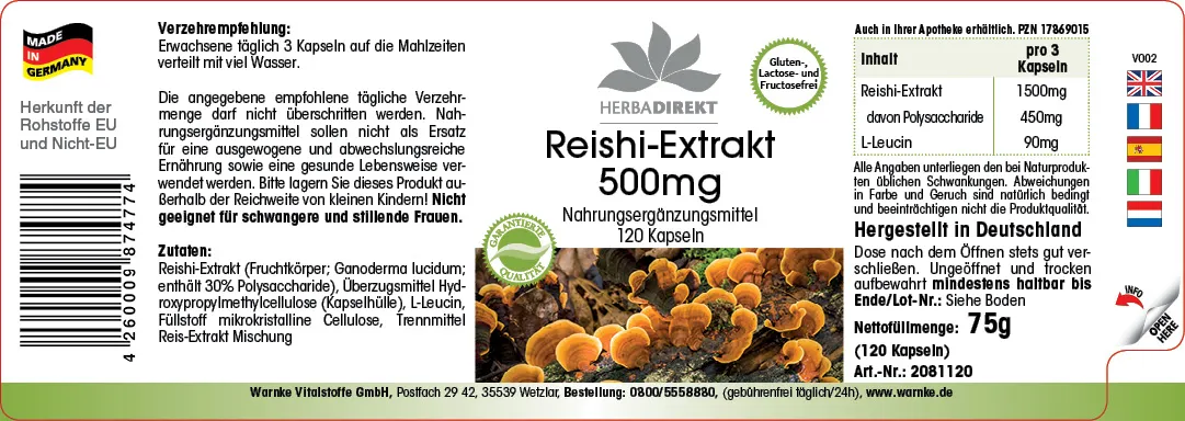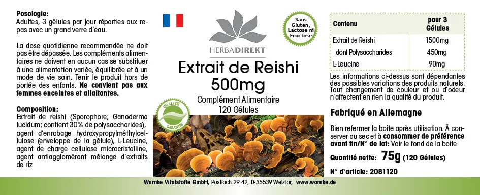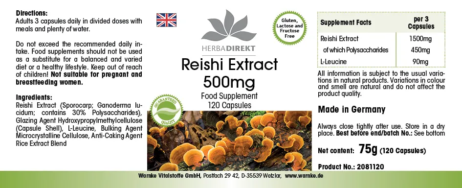 Extracto de Reishi (Ganoderma lucidum; contiene un 30% de polisacáridos), agente de recubrimiento hidroxipropilmetilcelulosa (cubierta de la cápsula), L-Leucina