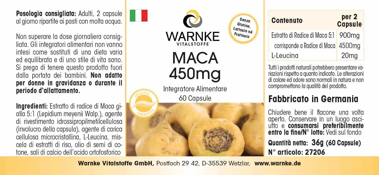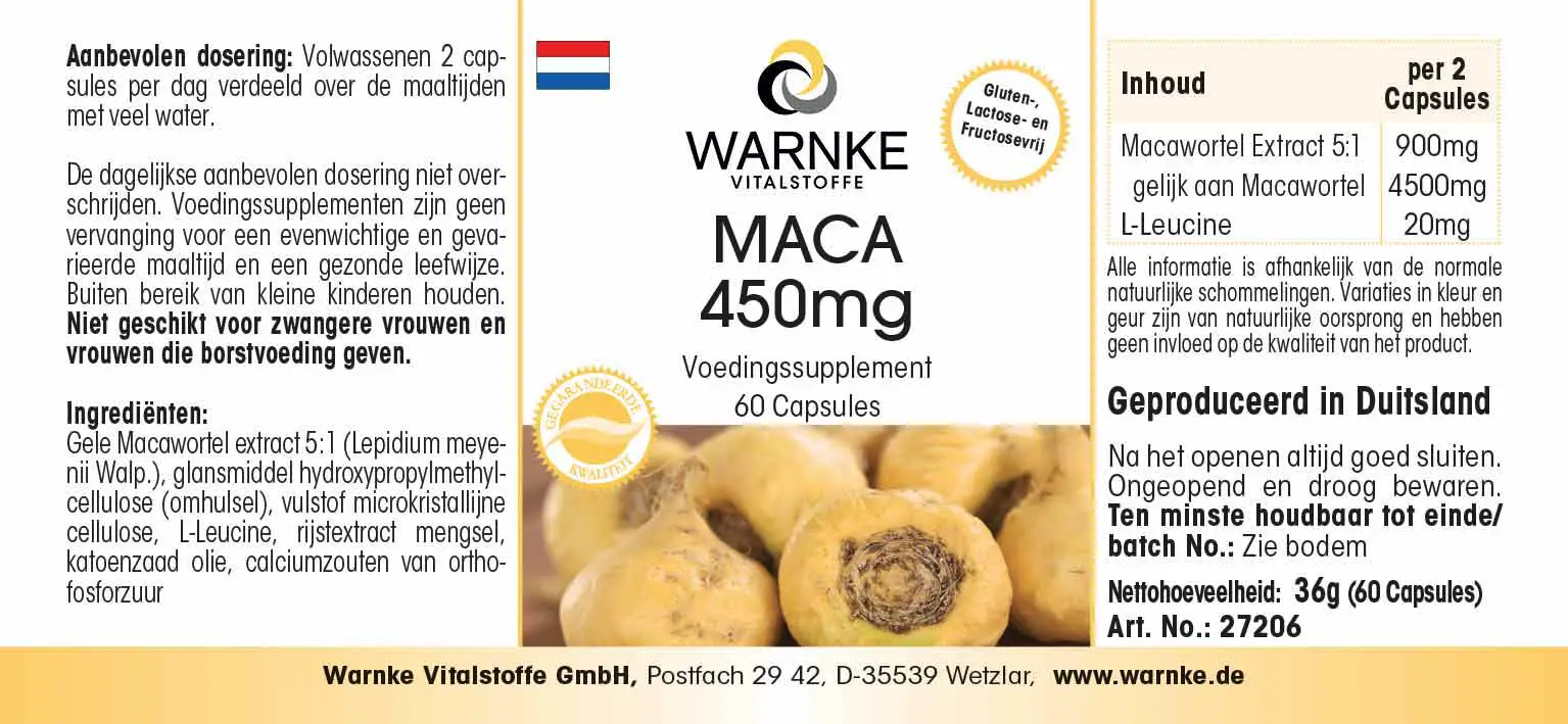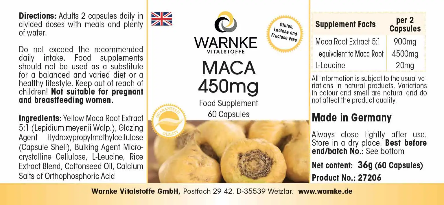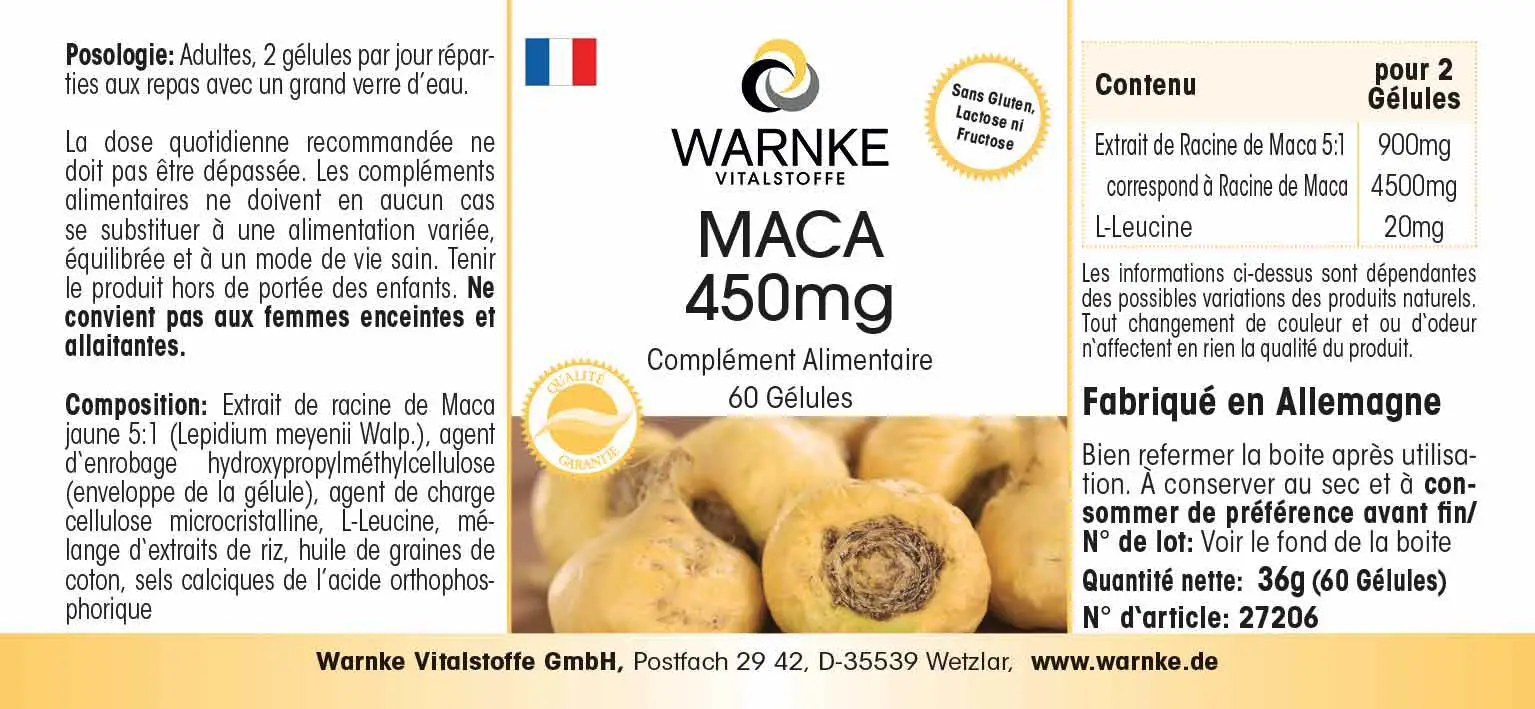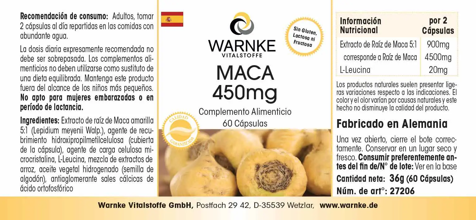 Raíz de Maca amarilla en polvo 4:1 de cultivo ecológico (Lepidium meyenii; según DE-ÖKO-006), agente de recubrimiento hidroxipropilmetilcelulosa (cubierta de la cápsula), agente de carga celulosa microcristalina, L-Leucina