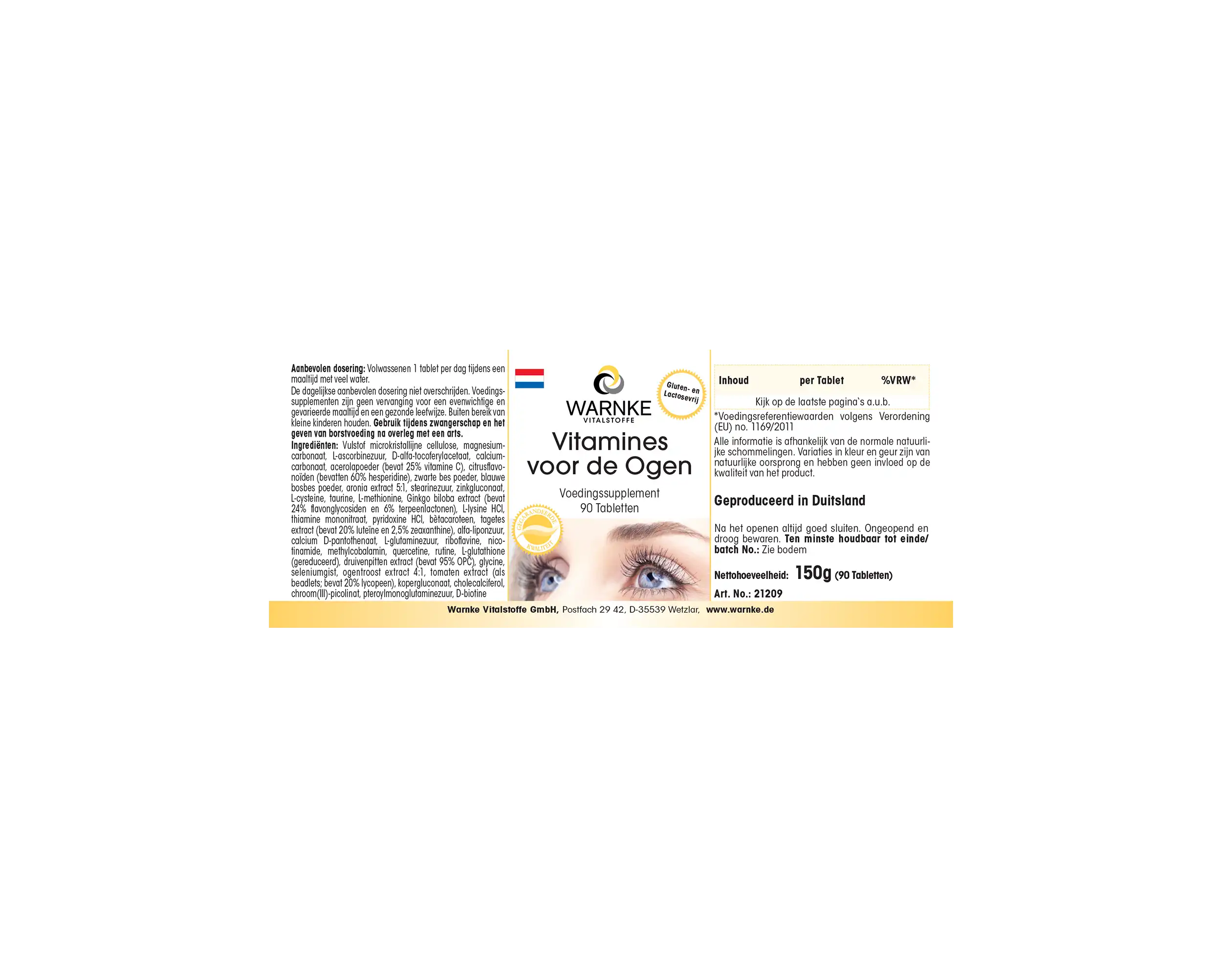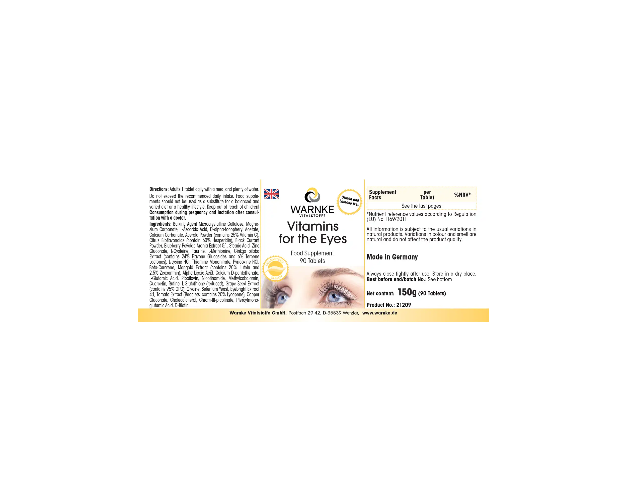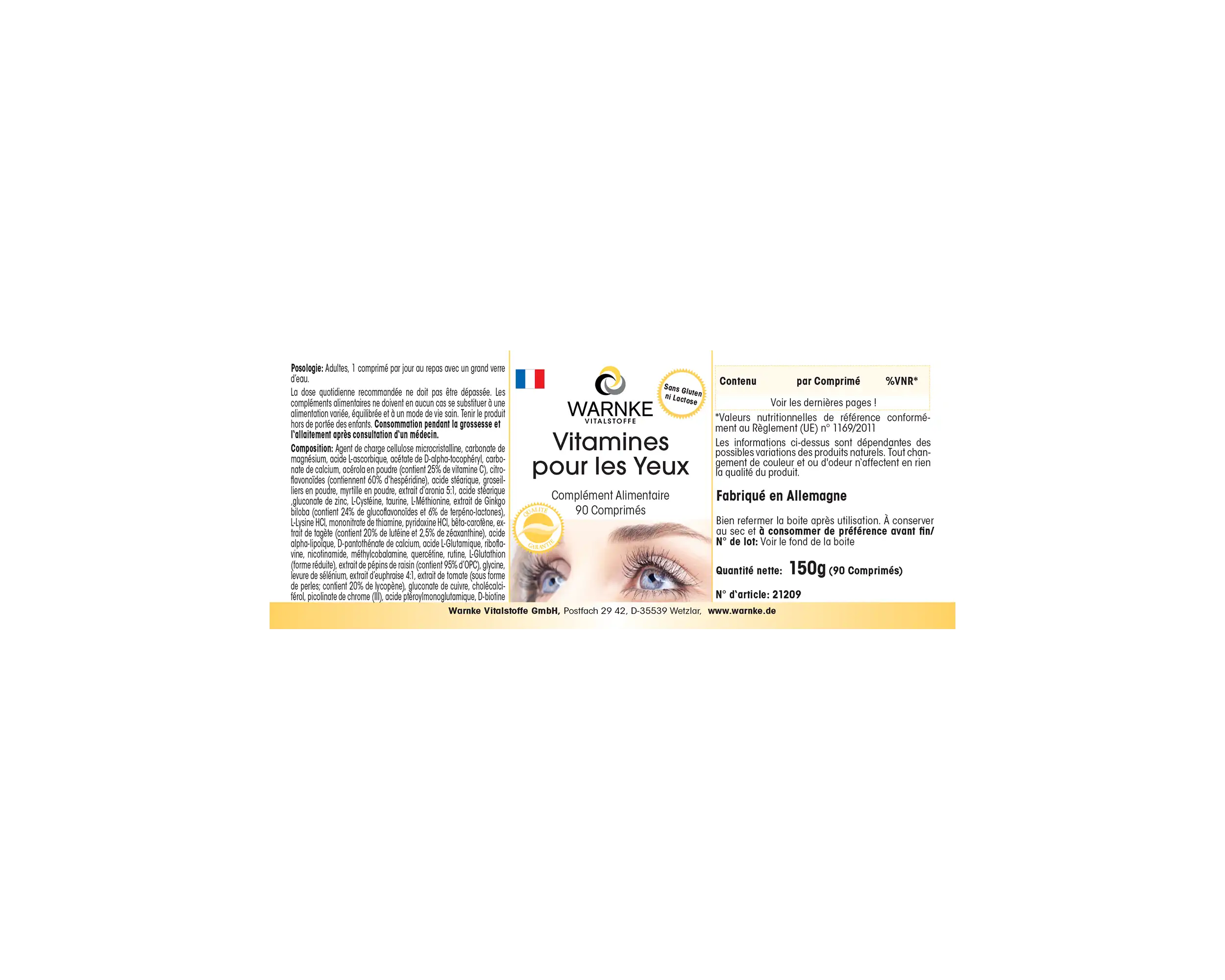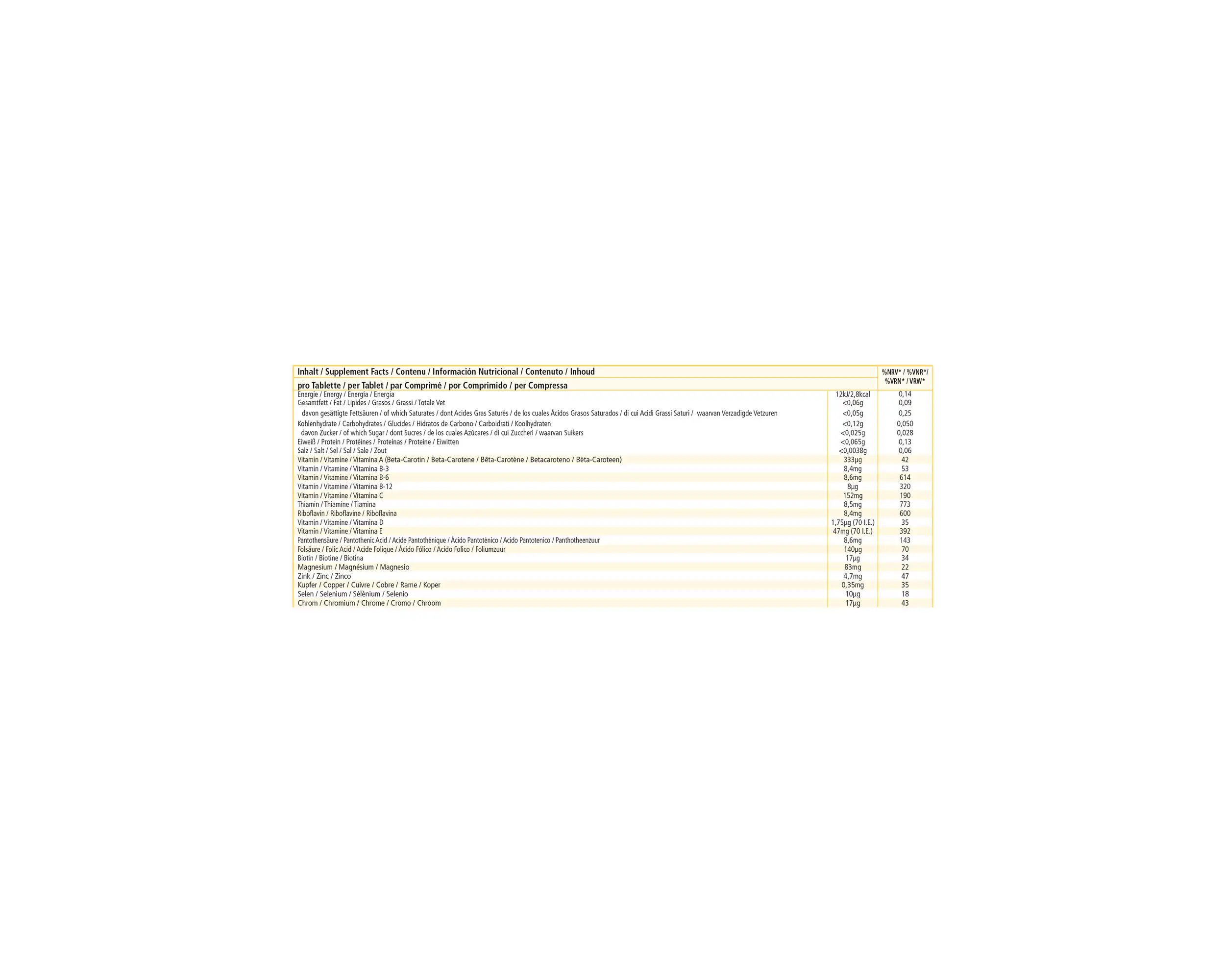 Agente de carga celulosa microcristalina, carbonato de magnesio, ácido L-ascórbico, acetato de D-alfa tocoferilo, carbonato de calcio, acerola en polvo, bioflavonoides cítricos, concentrado de grosella negra, concentrado de arándano, concentrado de Aronia, gluconato de zinc, antiaglomerante dióxido de silicio, L-Cisteína, taurina, L-Metionina, extracto de Ginkgo biloba, extracto de tomate (contiene un 5% de licopeno), antiaglomerante sales de magnesio de ácidos grasos, clorhidrato de L-Lisina, mononitrato de tiamina, clorhidrato de piridoxina, beta-caroteno, ácido alfa-lipoico, extracto de flor de Cempasúchil (contiene un 20% de luteína y un 2,5% de zeaxantina), ácido L-glutámico, D-pantotenato de calcio, L-Glutatión (reducido), riboflavina, nicotinamida, rutina, quercetina, cianocobalamina, antiaglomerante ácido esteárico, extracto de semilla de uva (contiene un 95% de OPC), levadura de selenio, glicina, eufrasia en polvo, gluconato de cobre, cromo aminoquelado, colecalciferol, ácido pteroilmonoglutámico, D-biotina