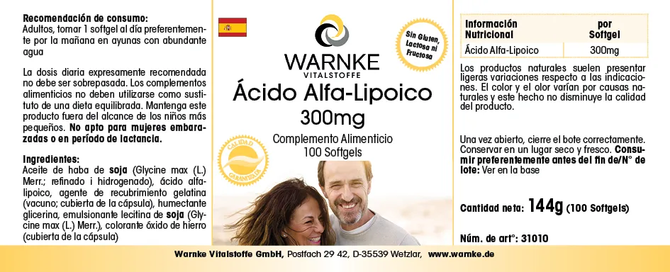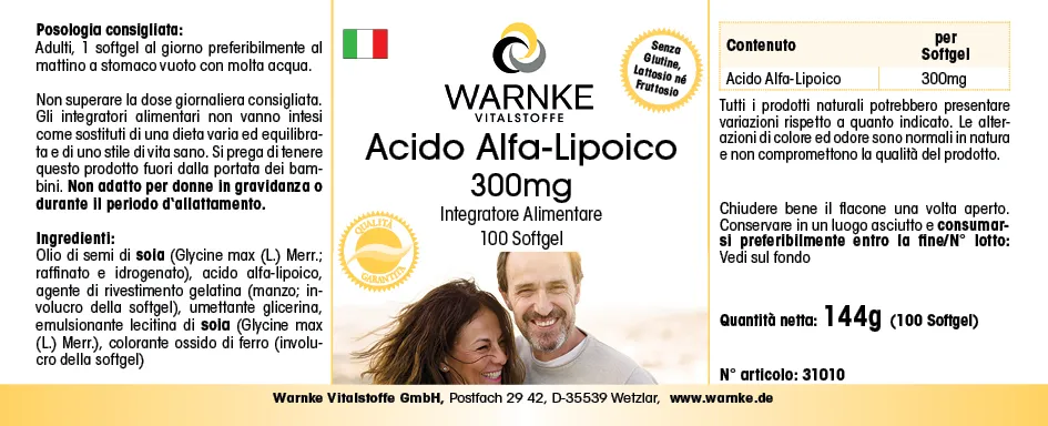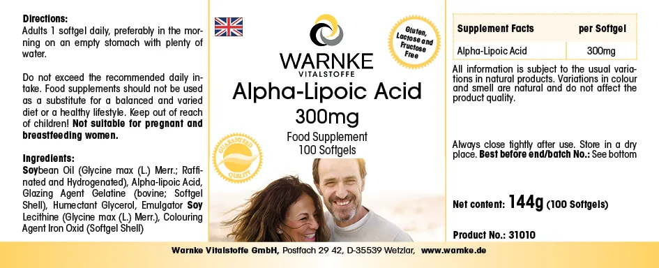 Produktinformationen "Alpha-Liponsäure 300mg - 100 Softgels - schwefelhaltige Fettsäure | Warnke Vitalstoffe"