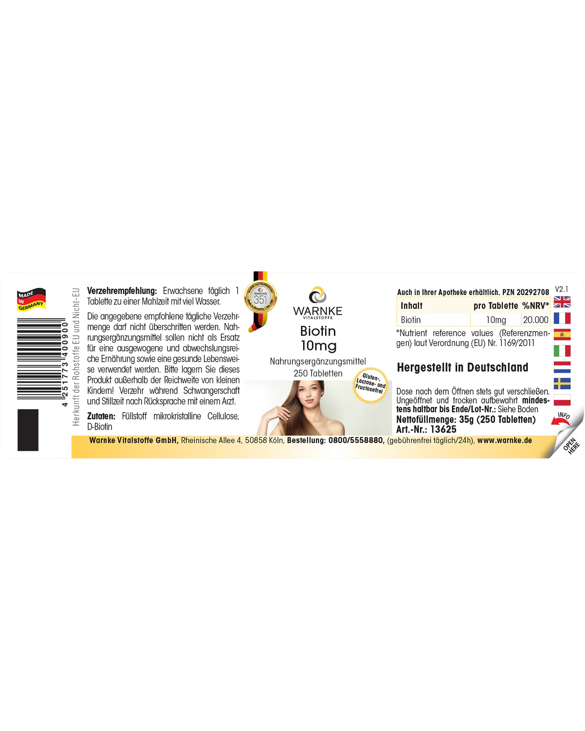 Produktinformationen "Biotin 10mg - 250 Tabletten - für Haut, Haare, Nervensystem uvm. - Hochdosiert - Vegan | Warnke Vitalstoffe"