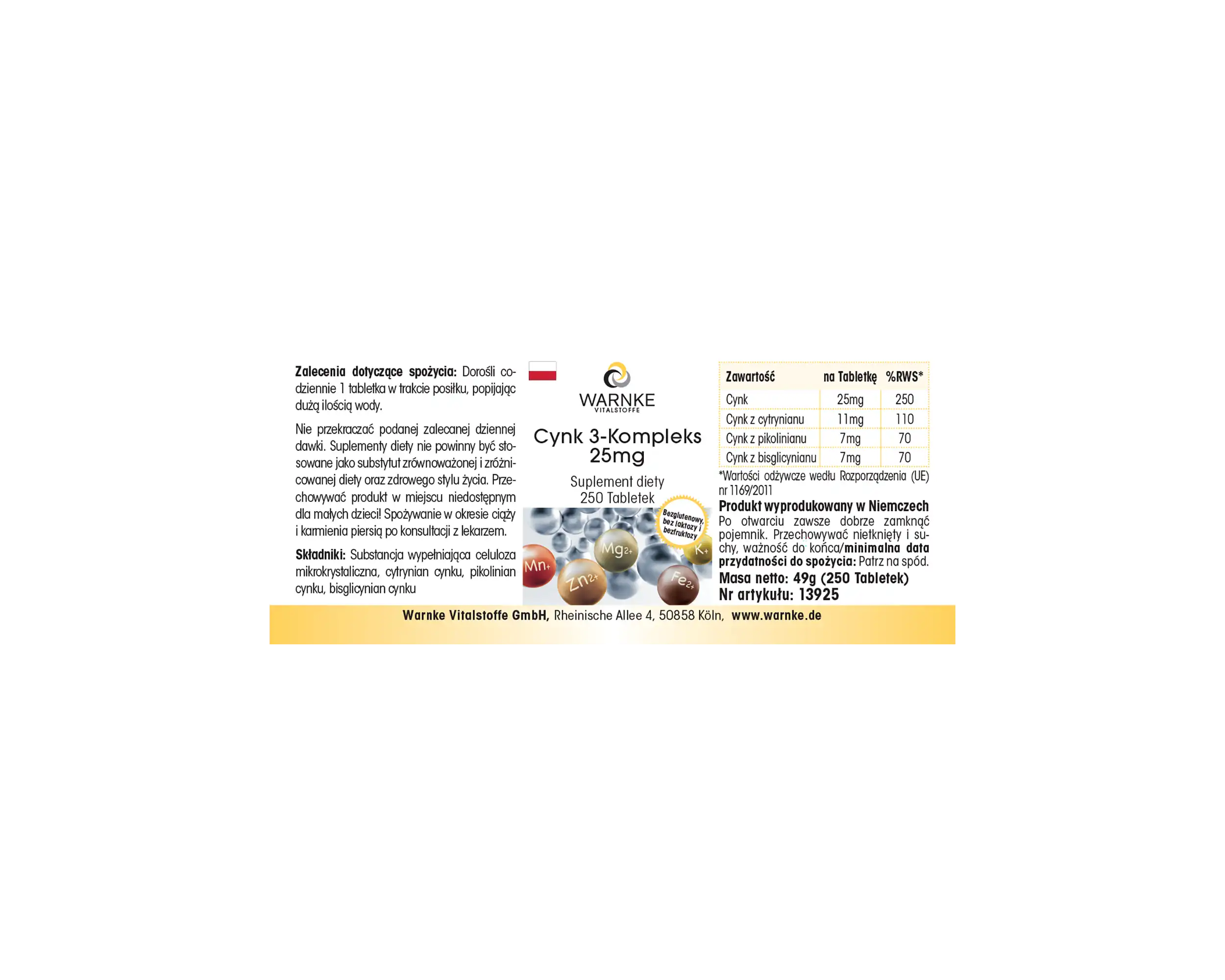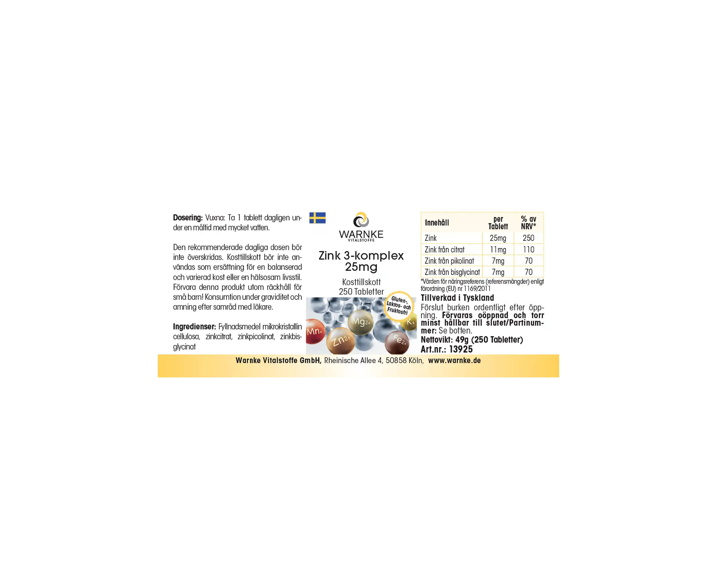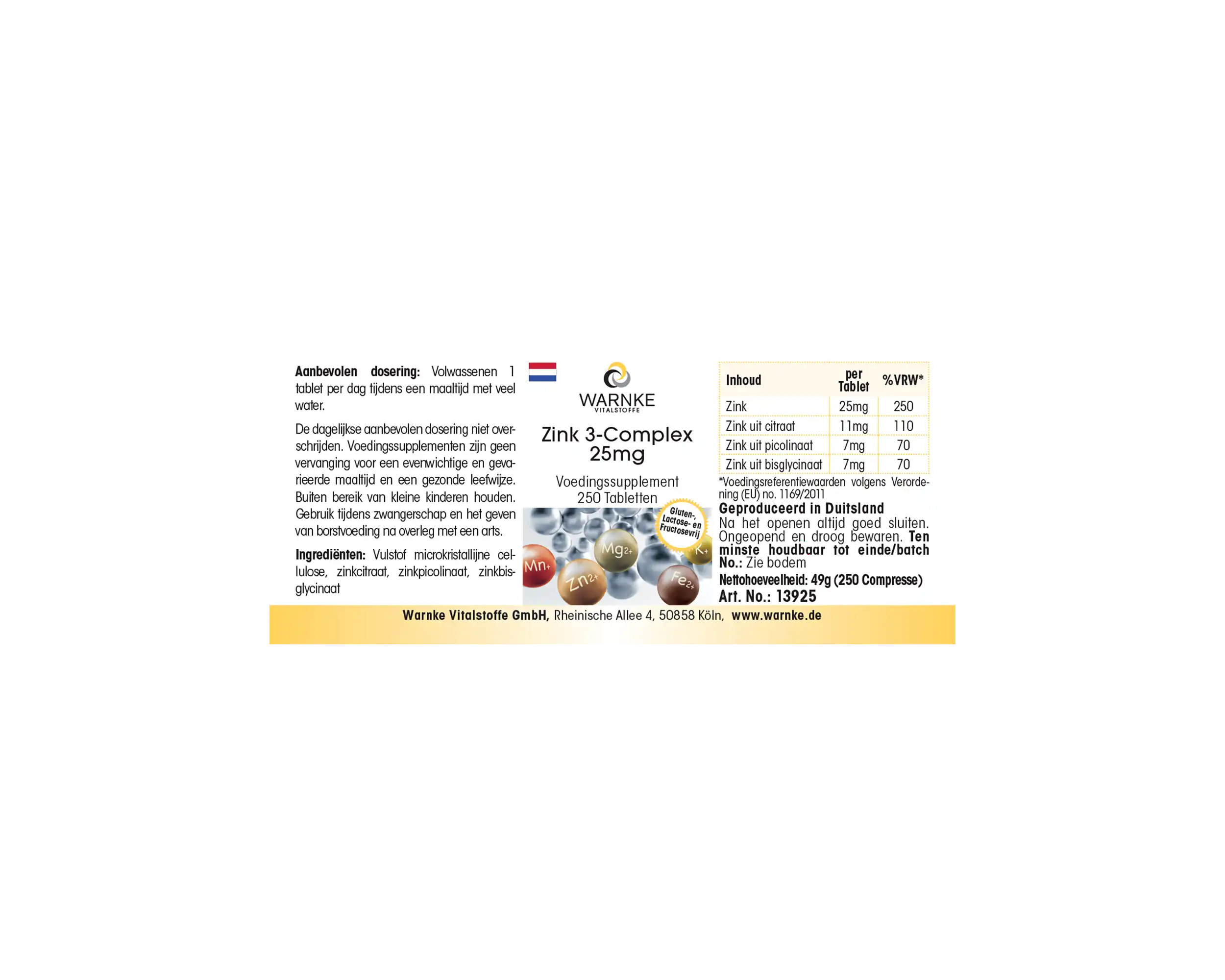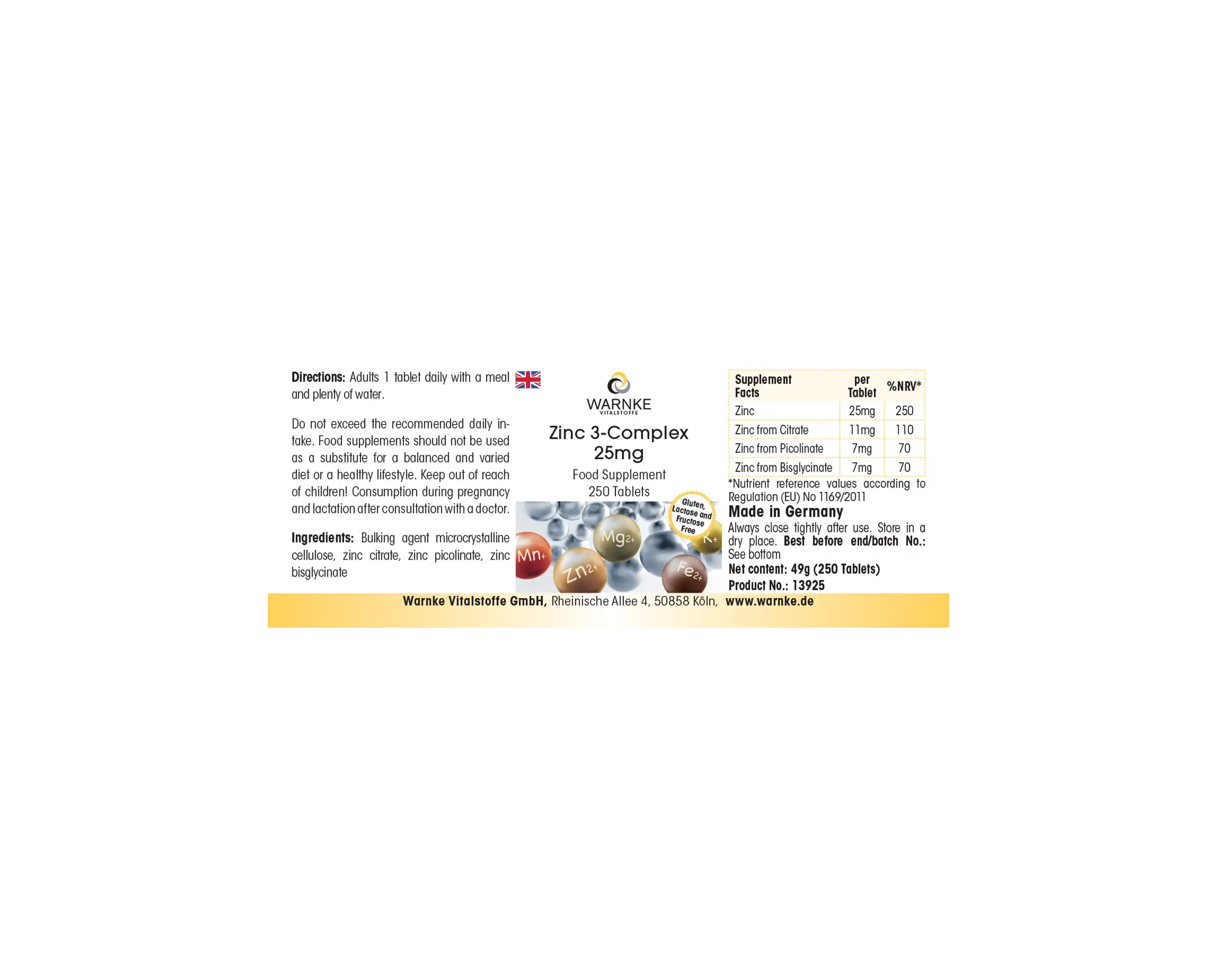 Produktinformationen "Zink-3er-Komplex 25mg - 250 Tabletten - für Immunsystem, Knochen, Haut uvm. - hochdosiert & vegan | Warnke Vitalstoffe"