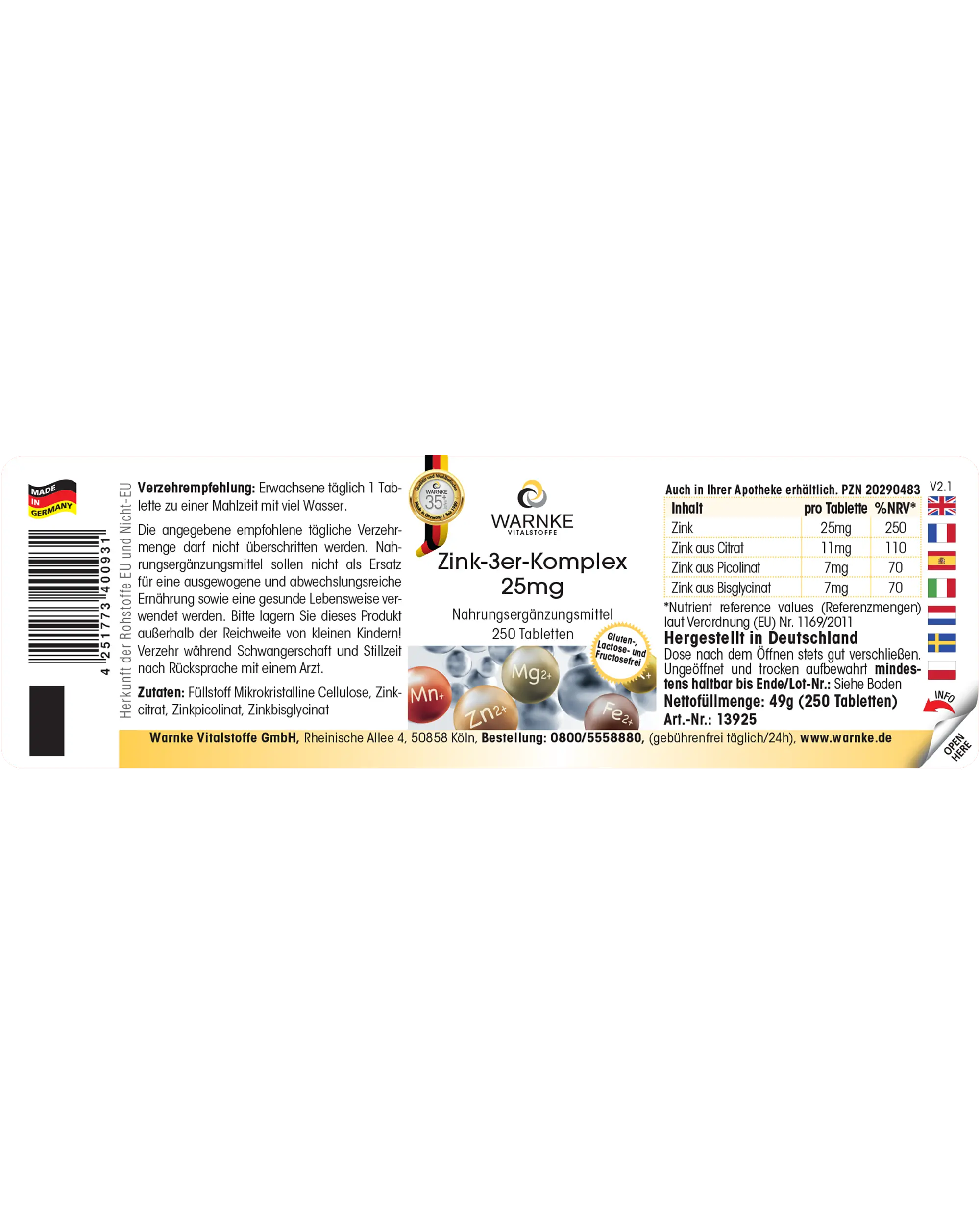 Zink-3er-Komplex 25mg - 250 Tabletten - für Immunsystem, Knochen, Haut uvm. - hochdosiert & vegan | Warnke Vitalstoffe