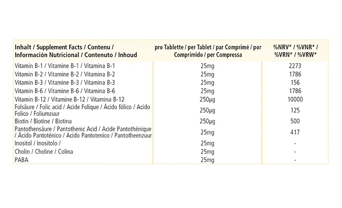 Méthylcobalamine, agent de charge cellulose microcristalline, bitartrate de choline, mononitrate de thiamine, chlorhydrate de pyridoxine, D-pantothénate de calcium, riboflavine, nicotinamide, inositol, acide para-aminobenzoïque, sels calciques de l’acide orthophosphorique, acide folique