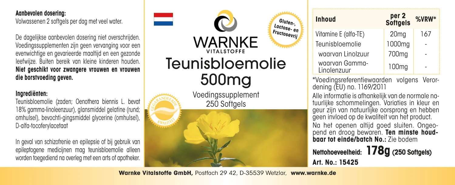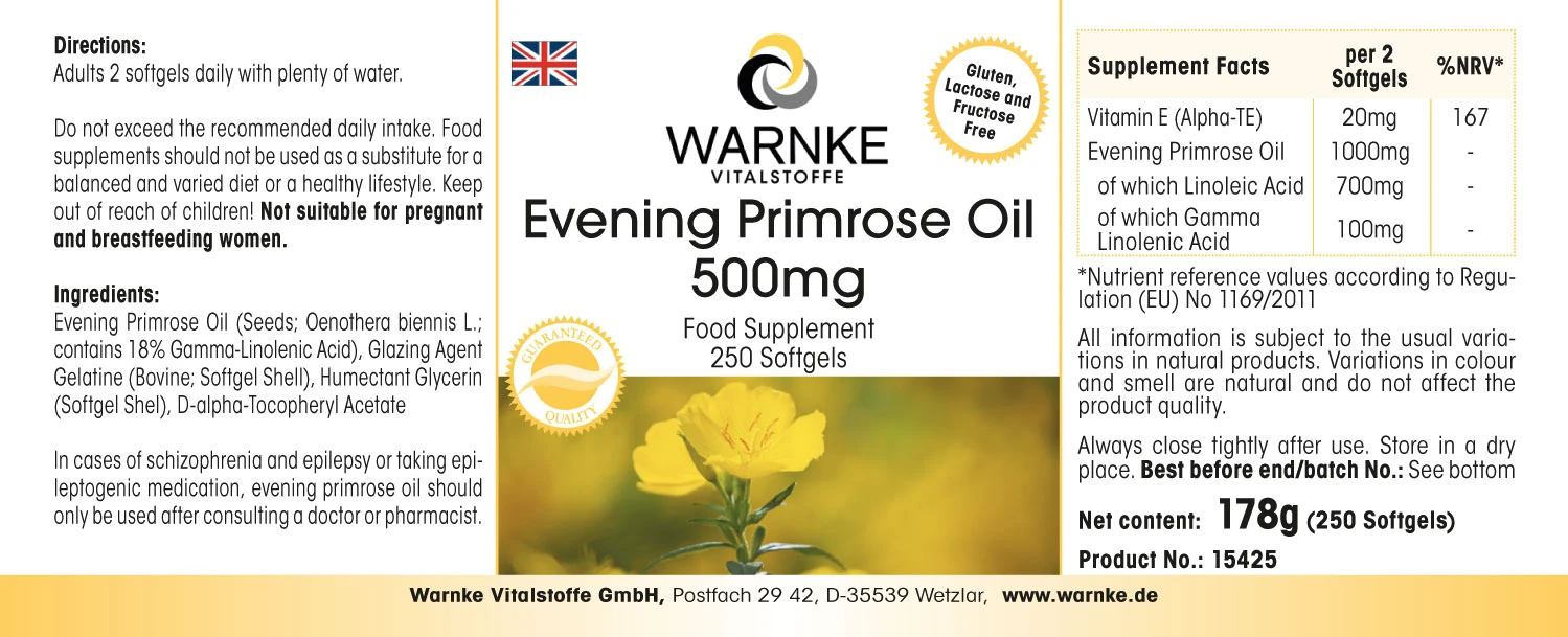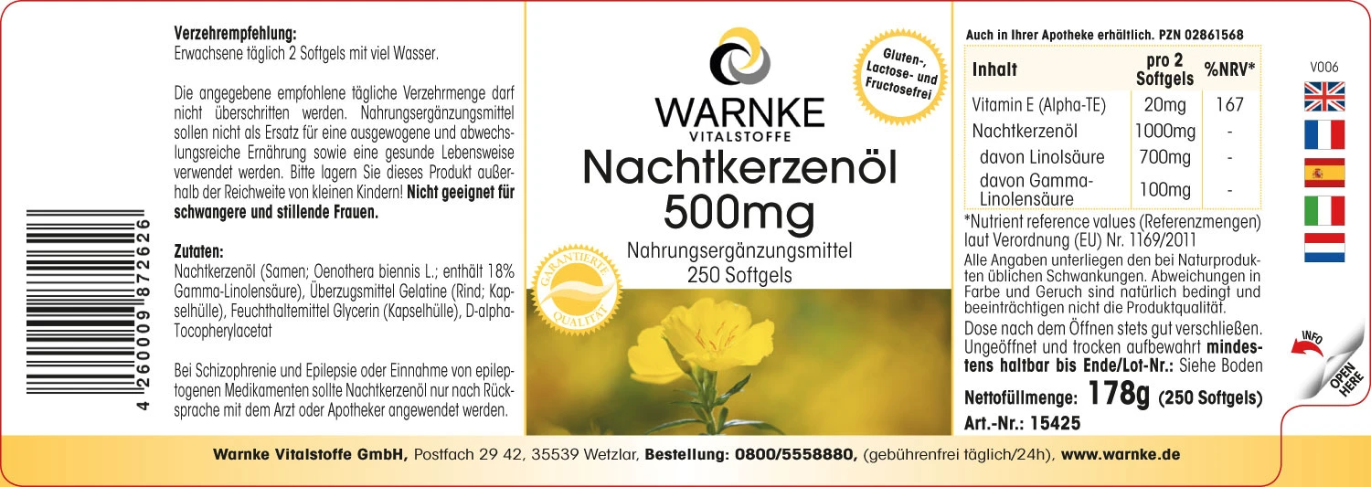 Huile d‘onagre (pression froide), gélatine (porc; enveloppe de la gélule), glycérine, D-alpha-tocophérol