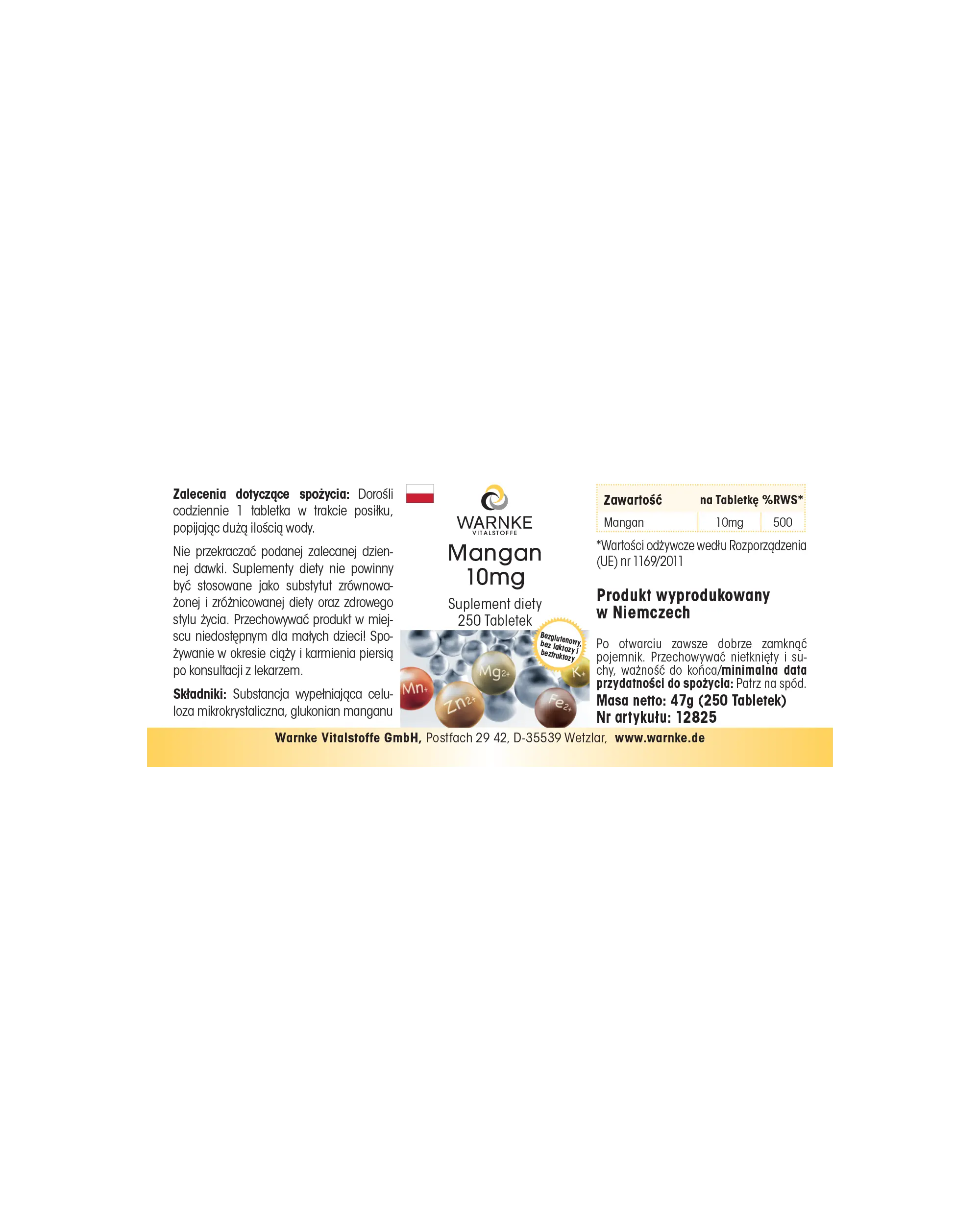 Les comprimés Manganèse 10 mg sont fabriqués en Allemagne selon des normes de qualité et d'hygiène HACCP strictes. Les comprimés sont exempts de gluten, de lactose et de fructose, ainsi que de colorants et d'additifs inutiles, ce qui en fait un produit pur et soigneusement élaboré.