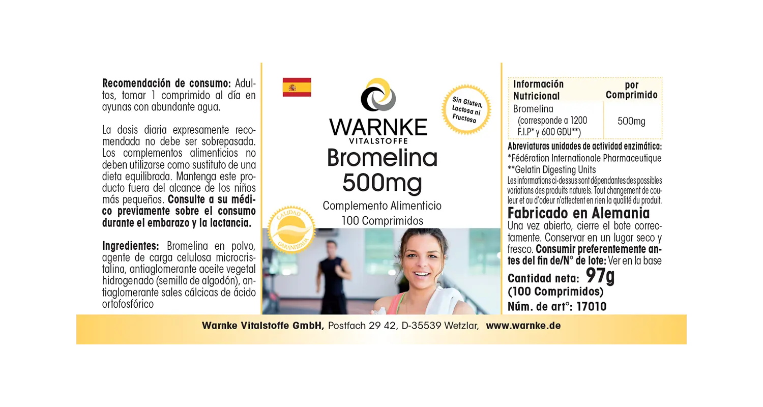 Dieses Produkt enthält Bromelain-Pulver in einer Dosis von 500 mg pro Tablette, mit einer Aktivität von 1200 F.I.P. (Food Chemical Codex, FCC). Es ist mit mikrokristalliner Cellulose als Füllstoff und Baumwollsamenöl sowie Calciumsalzen der Orthophosphorsäure als Trennmittel formuliert.