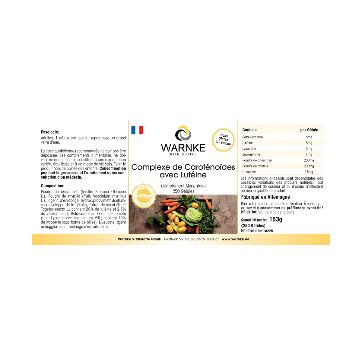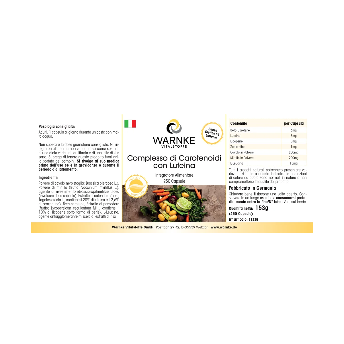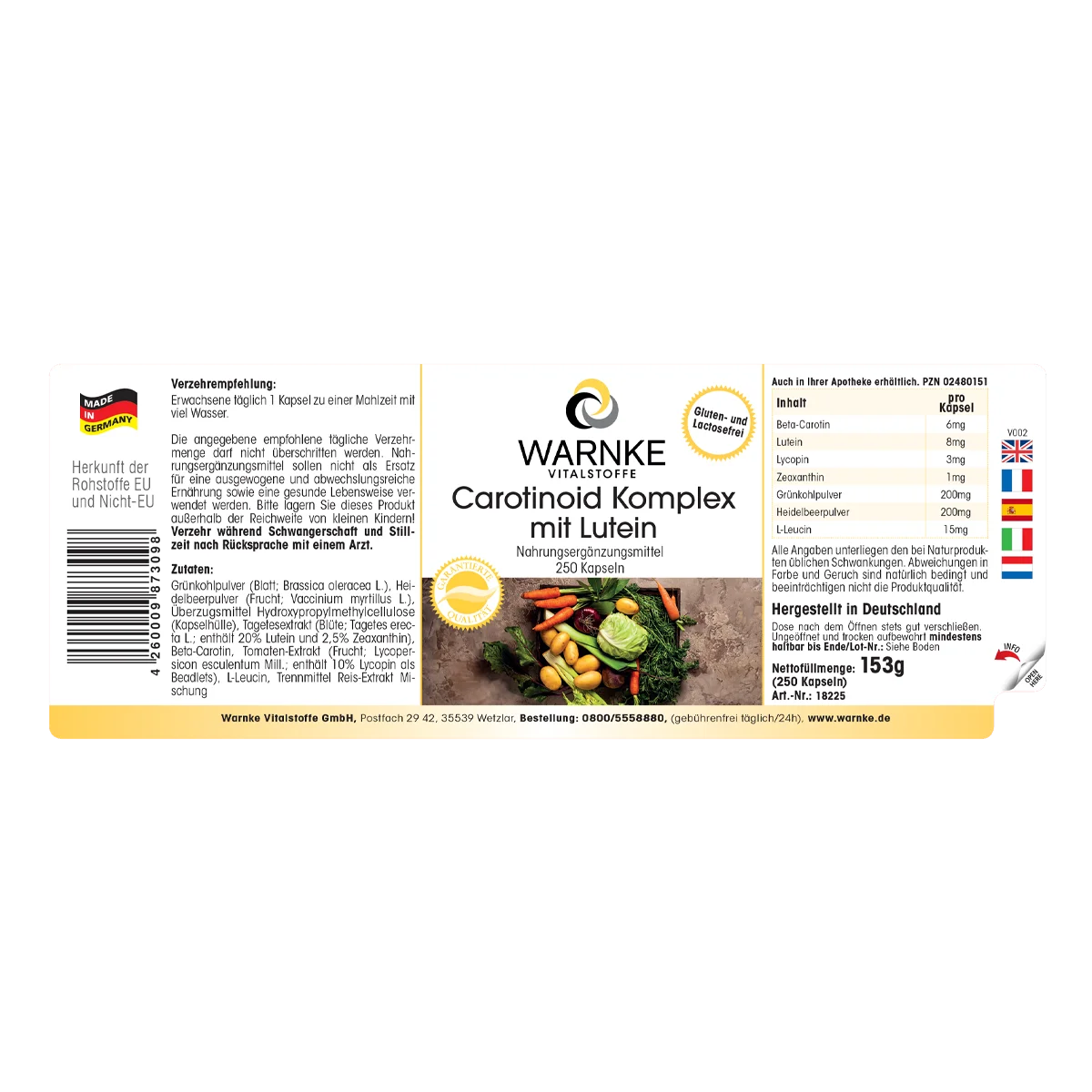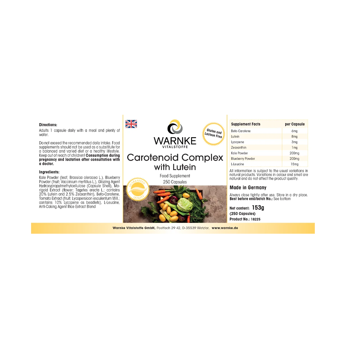 Produktinformationen "Carotinoid Komplex - 250 Kapseln - mit Lutein, Heidelbeerpulver, Beta-Carotin, Zeaxanthin uvm. - Vegan | Warnke Vitalstoffe"