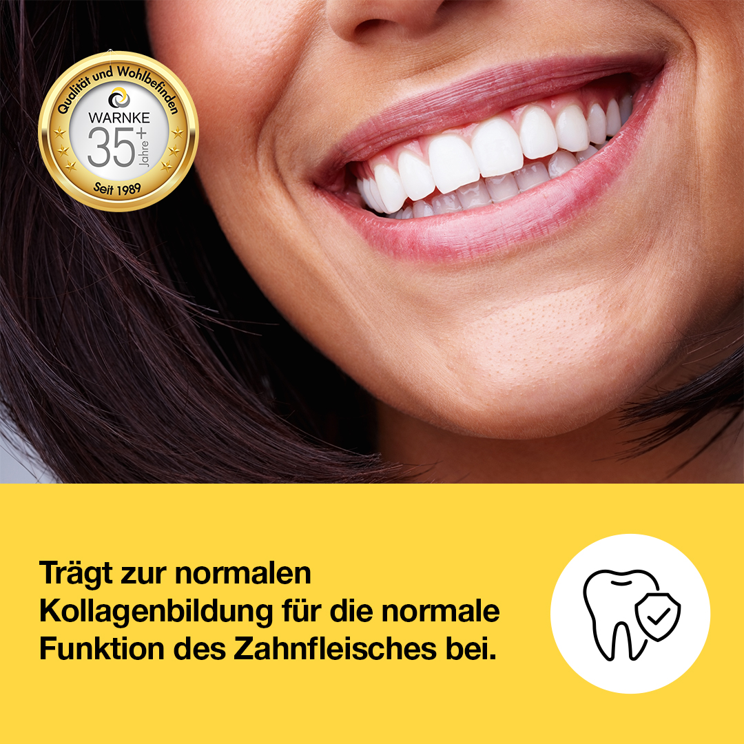 - Vitamin C trägt zu einer normalen Kollagenbildung für die normale Funktion der Zähne bei.
