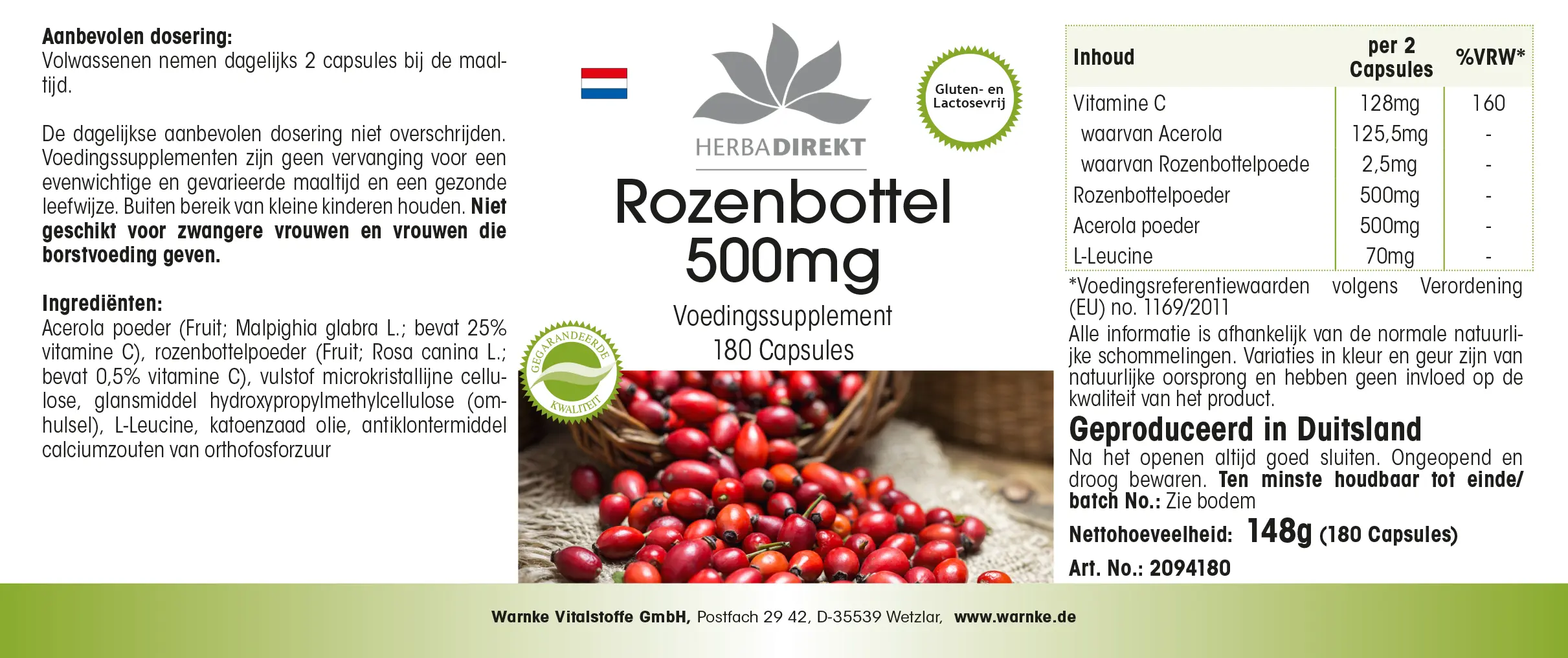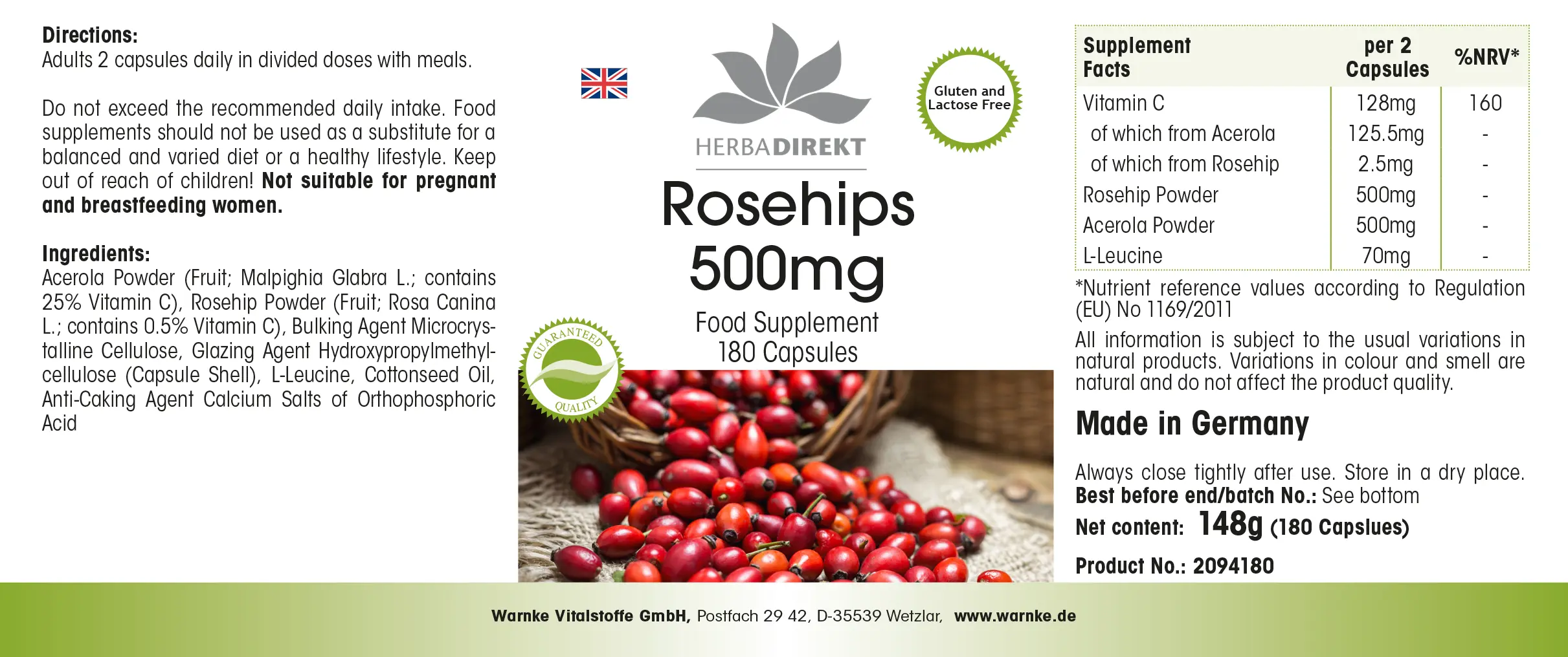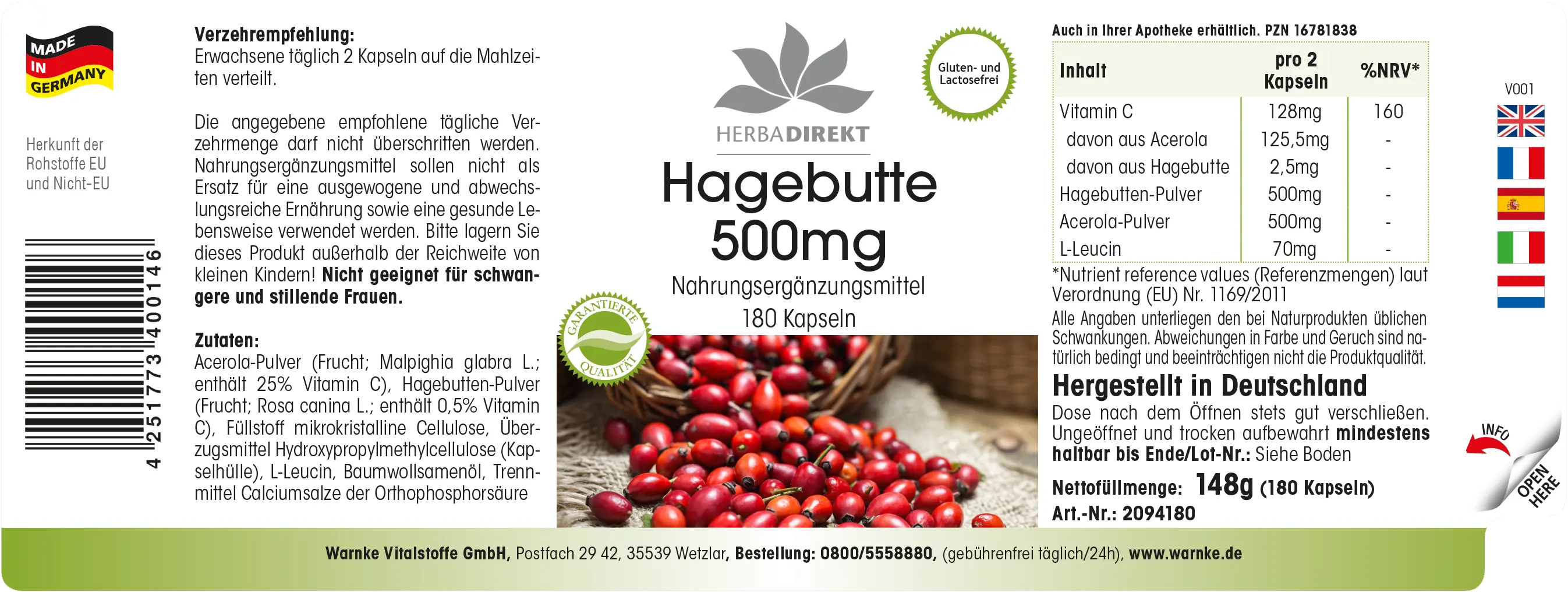 Produktinformationen "Hagebutte 500mg - 180 Kapseln - mit Vitamin C - Immunsystem, Kollagenbildung uvm. | Herba Direkt"