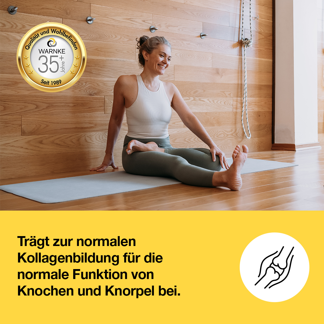 - Vitamin C trägt zur normalen Kollagenbildung für die normale Funktion von Haut, Zahnfleisch, Knochen, Knorpel und Blutgefäßen bei.