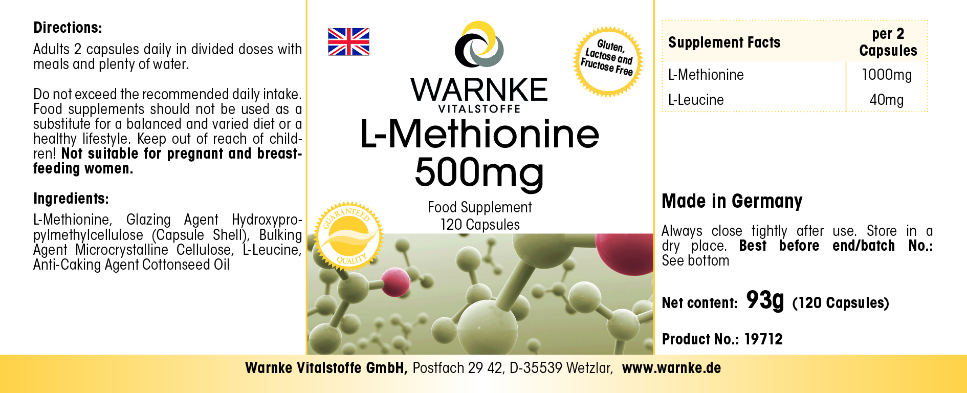 Produktinformationen "L-Methionin 500mg - 120 Kapseln - essentielle Aminosäure - Vegan | Warnke Vitalstoffe"