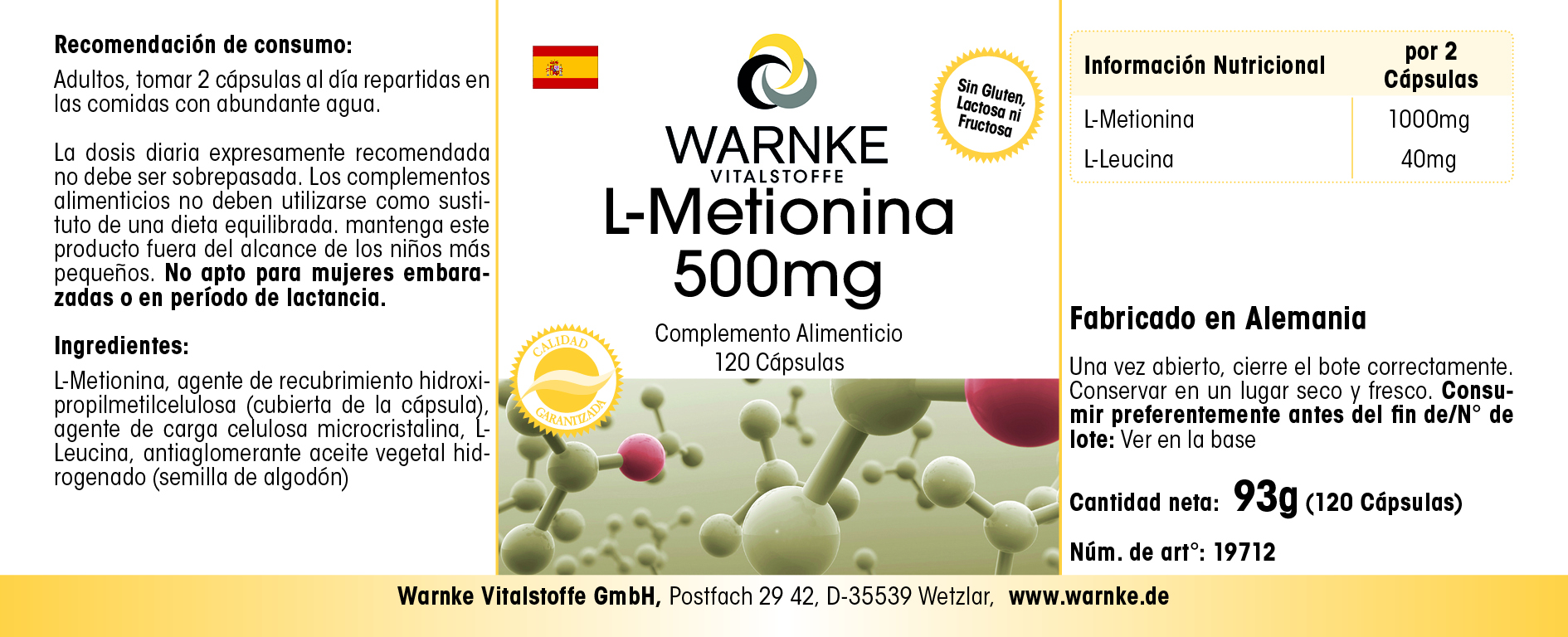 L-Methionin 500mg - 120 Kapseln - essentielle Aminosäure - Vegan | Warnke Vitalstoffe