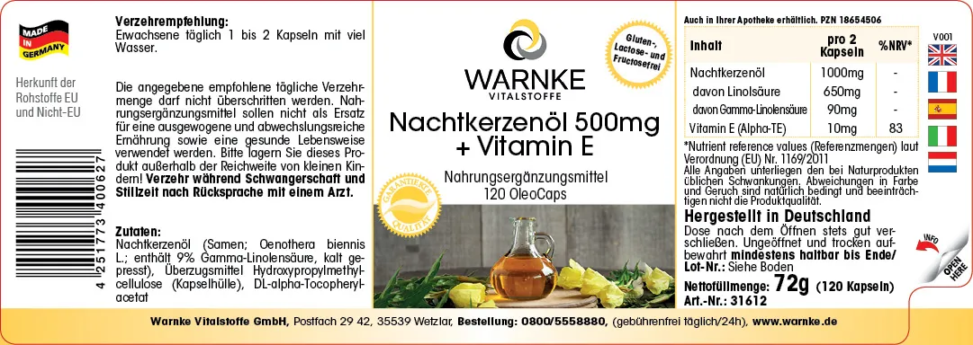 Produktinformationen "Nachtkerzenöl 500mg + Vitamin E - 120 OleoCaps - für Zellschutz - Vegan | Warnke Vitalstoffe"