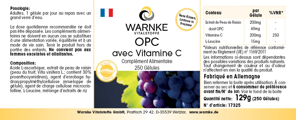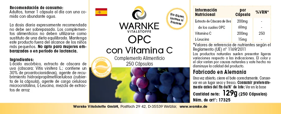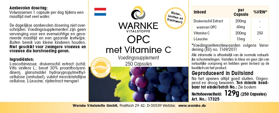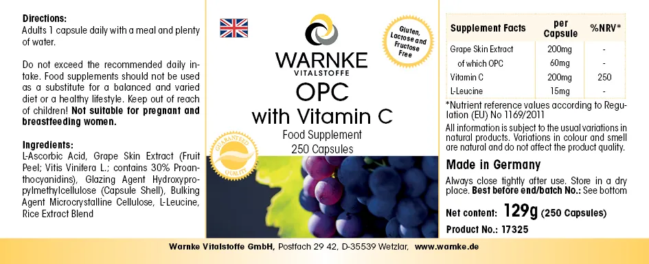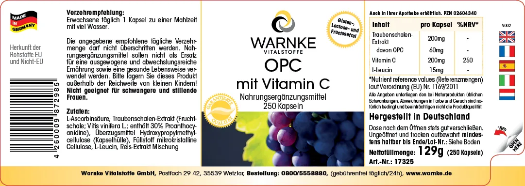 Produktinformationen "OPC mit Vitamin C - 250 Kapseln - für Immunsystem, Kollagenbildung uvm. - Vegan | Warnke Vitalstoffe"