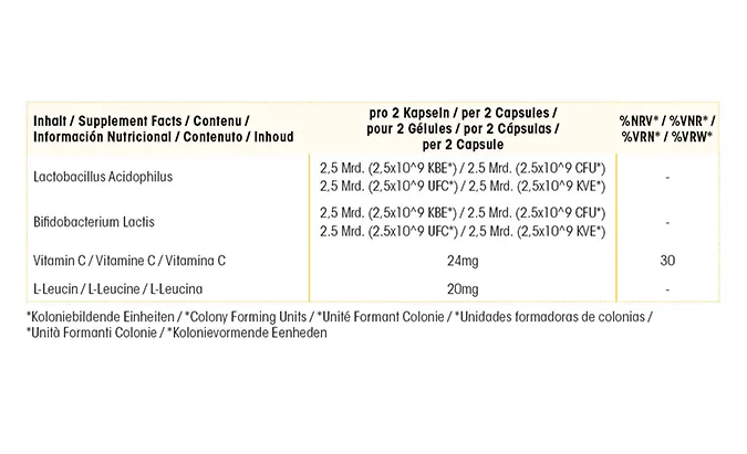 | Lactobacillus Acidophilus | 2.5 Mrd. (2.5x10^9 KBE*) / 2,5 Mrd. (2,5x10^9 CFU*) 2.5 Mrd. (2.5x10^9 UFC*) / 2,5 Mrd. (2,5x10^9 KVE*) |