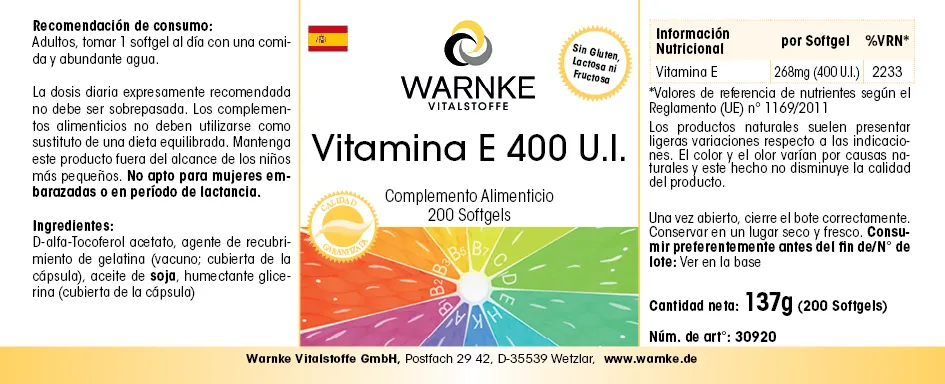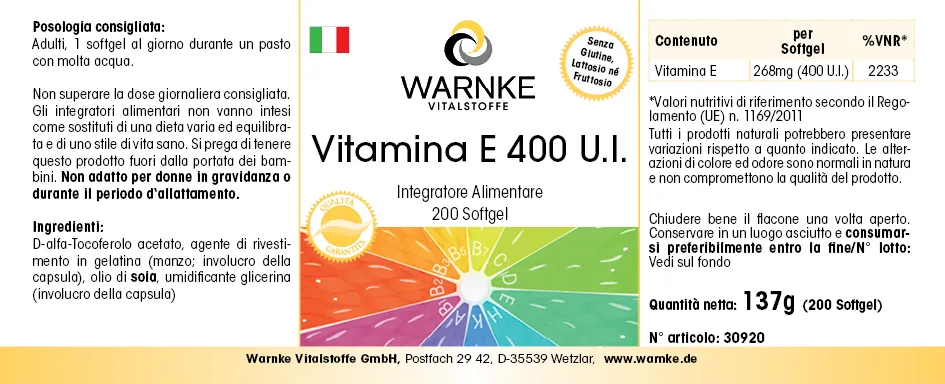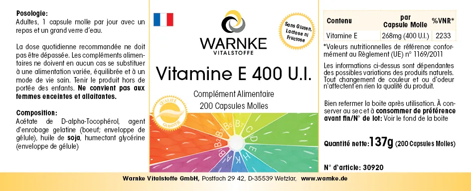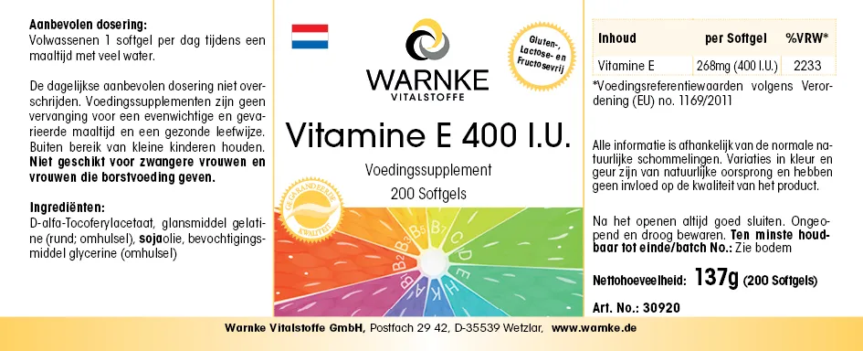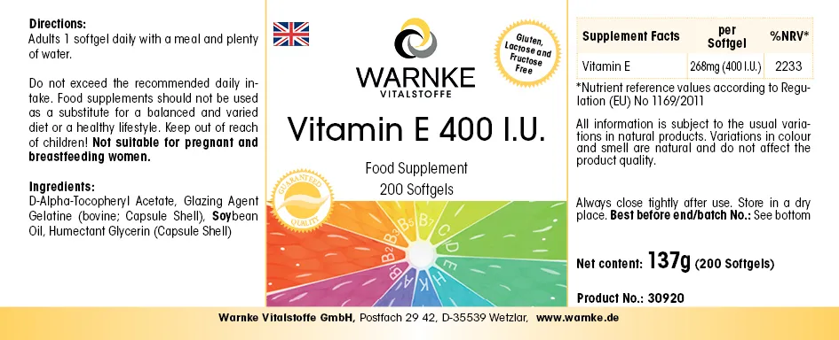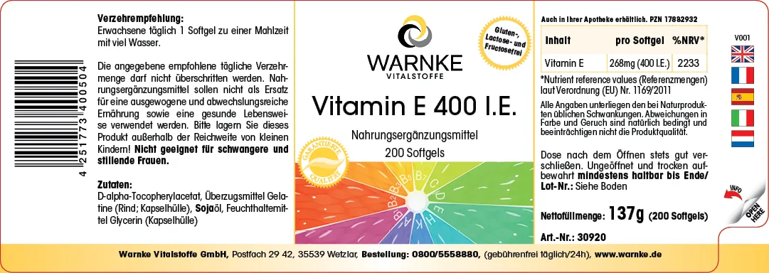 Produktinformationen "Vitamin E 400 I.E. - 200 Softgels - für Zellschutz | Warnke Vitalstoffe"