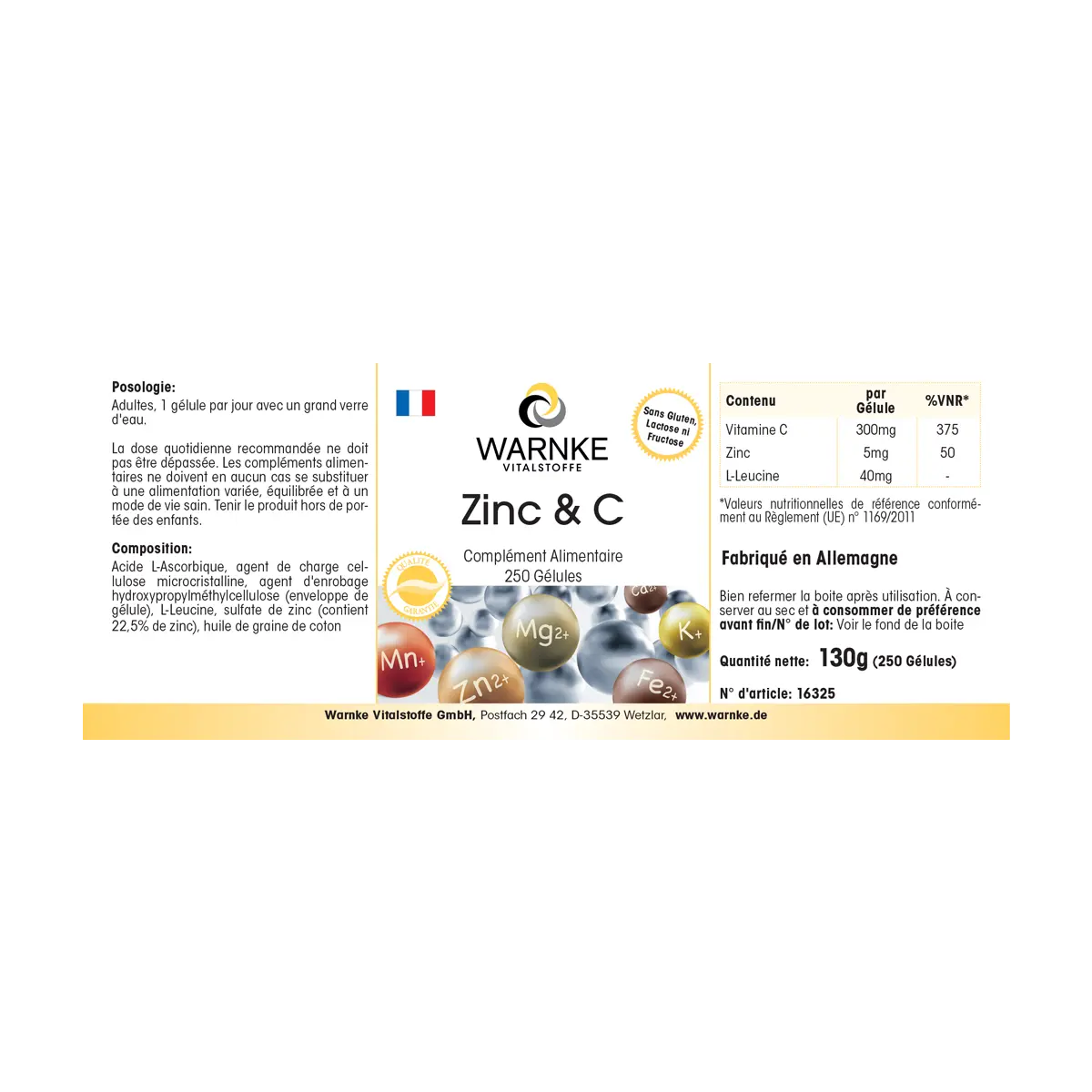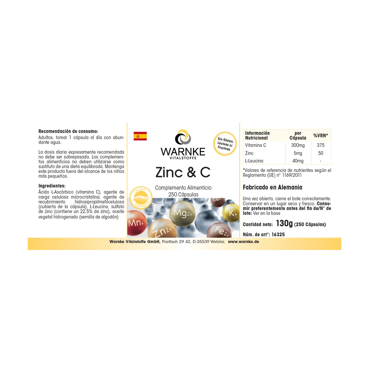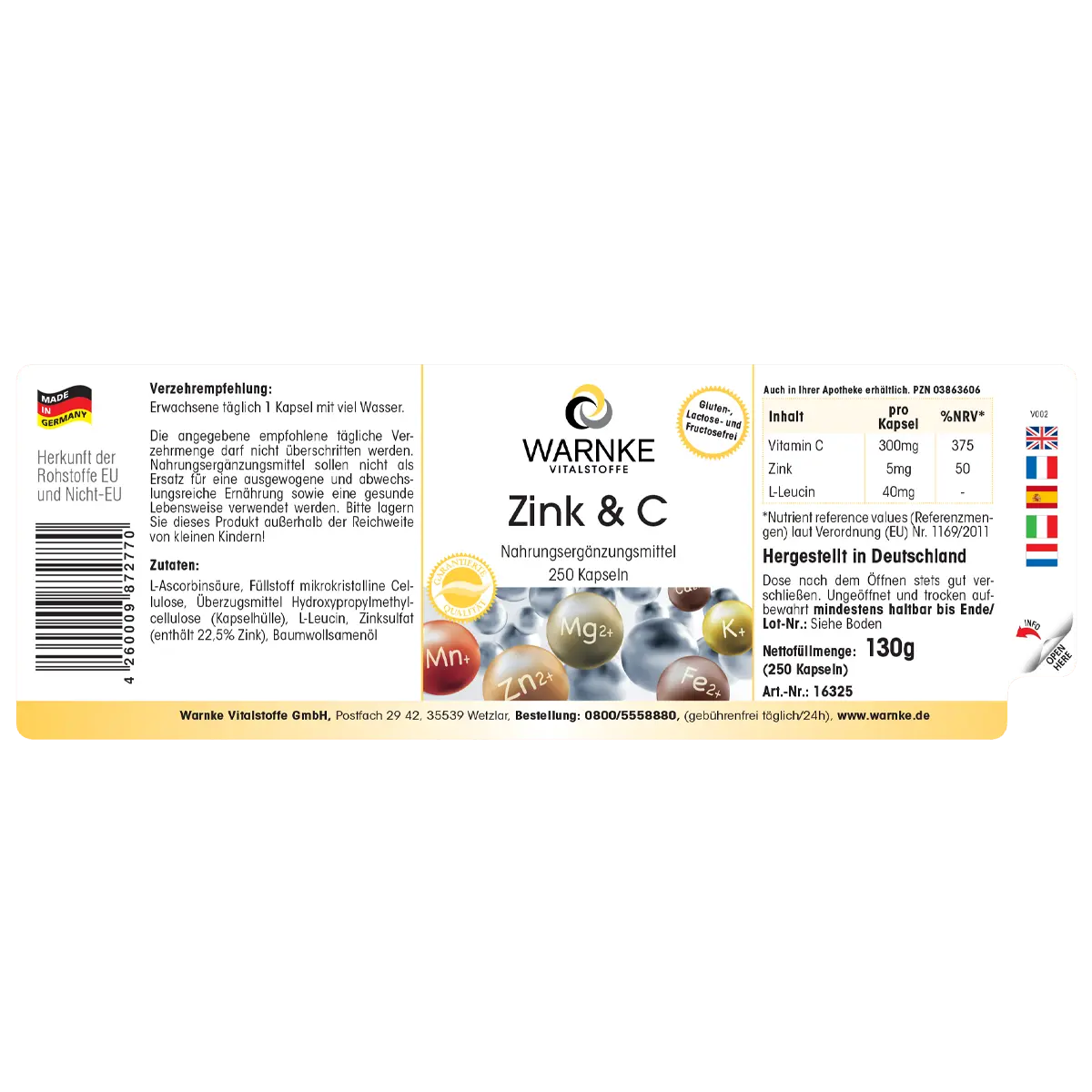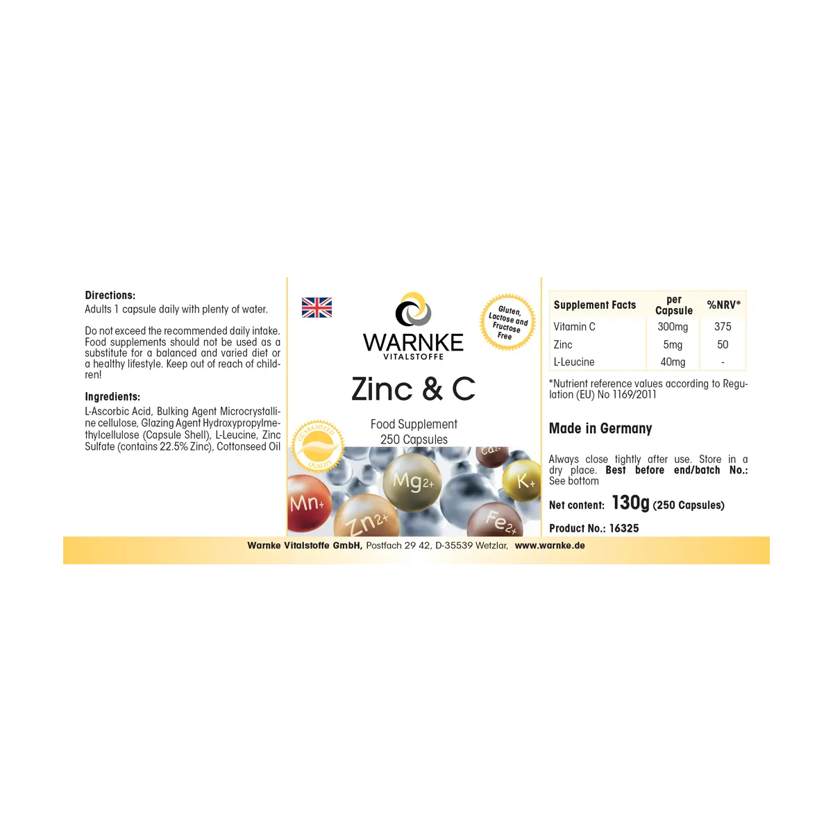 Produktinformationen "Zink & Vitamin C - 250 Kapseln - für Immunsystem, Kollagenbildung uvm. - Vegan | Warnke Vitalstoffe"