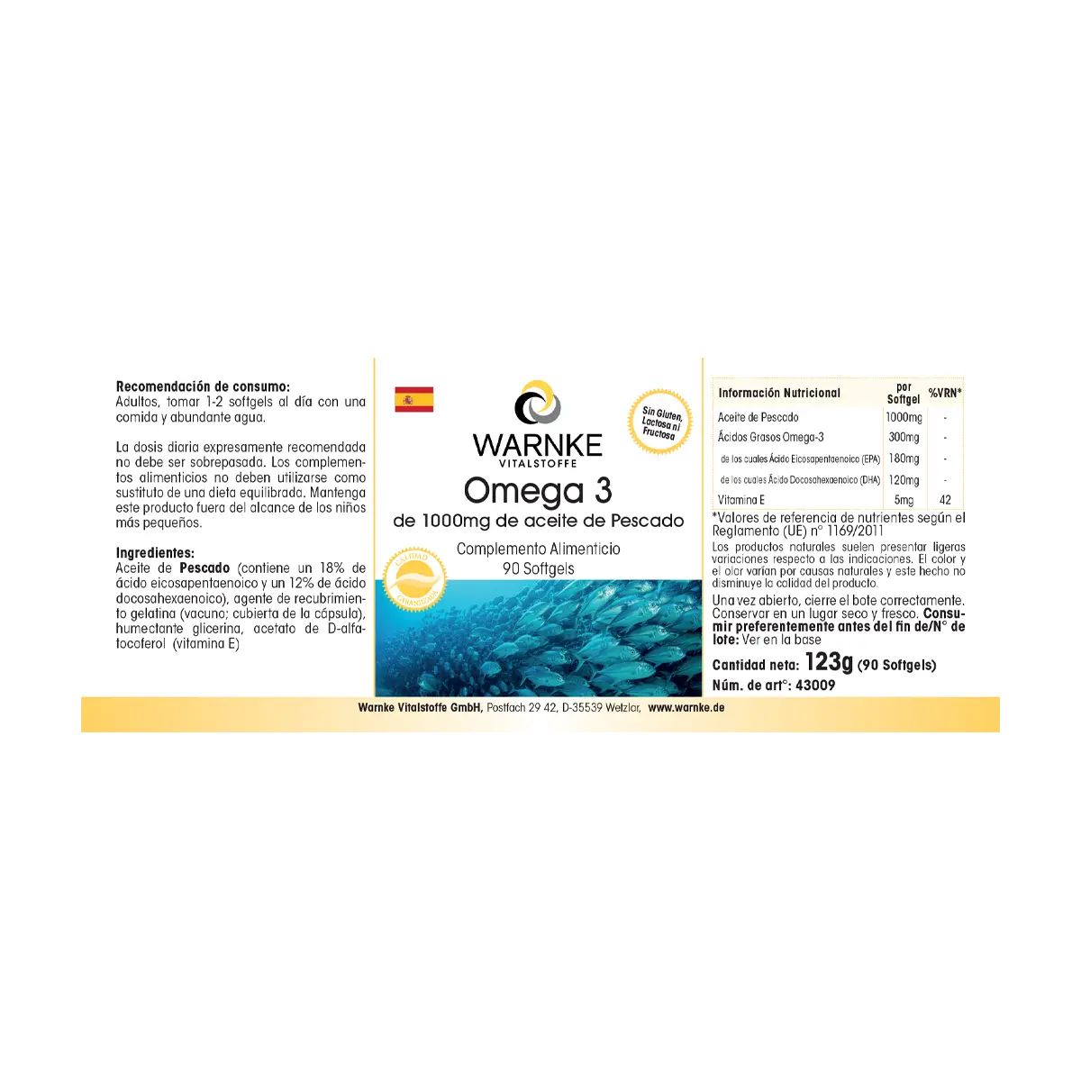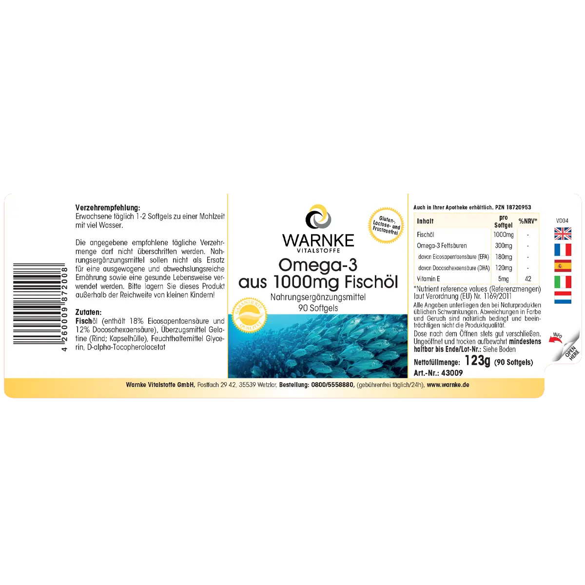 Fish oil (contains 18% Eicosapentaenoic acid and 12% Docosahexaenoic acid), Gelatin (bovine; capsule shell), Humectant Glycerin, D-alpha-Tocopheryl acetate