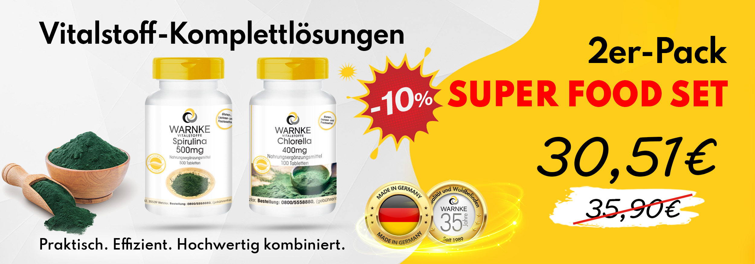 The set combines two popular microalgae supplements: Chlorella and Spirulina. Both have long been used as dietary supplements and stand for natural variety. Conveniently bundled in one set – in proven Warnke quality.