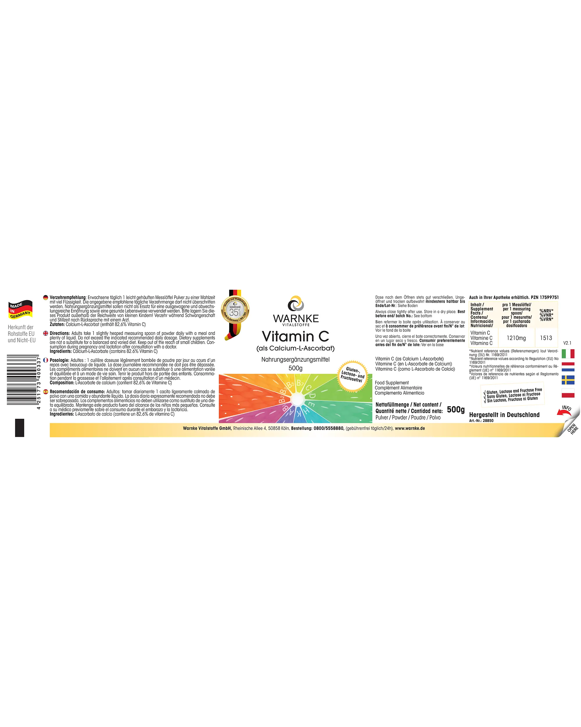 Vitamin C Ascorbate 500g Powder contains calcium L-ascorbate, a form of vitamin C that provides 82.6% vitamin C. It is a stable and well-tolerated source of ascorbic acid, which plays an important role in the body.