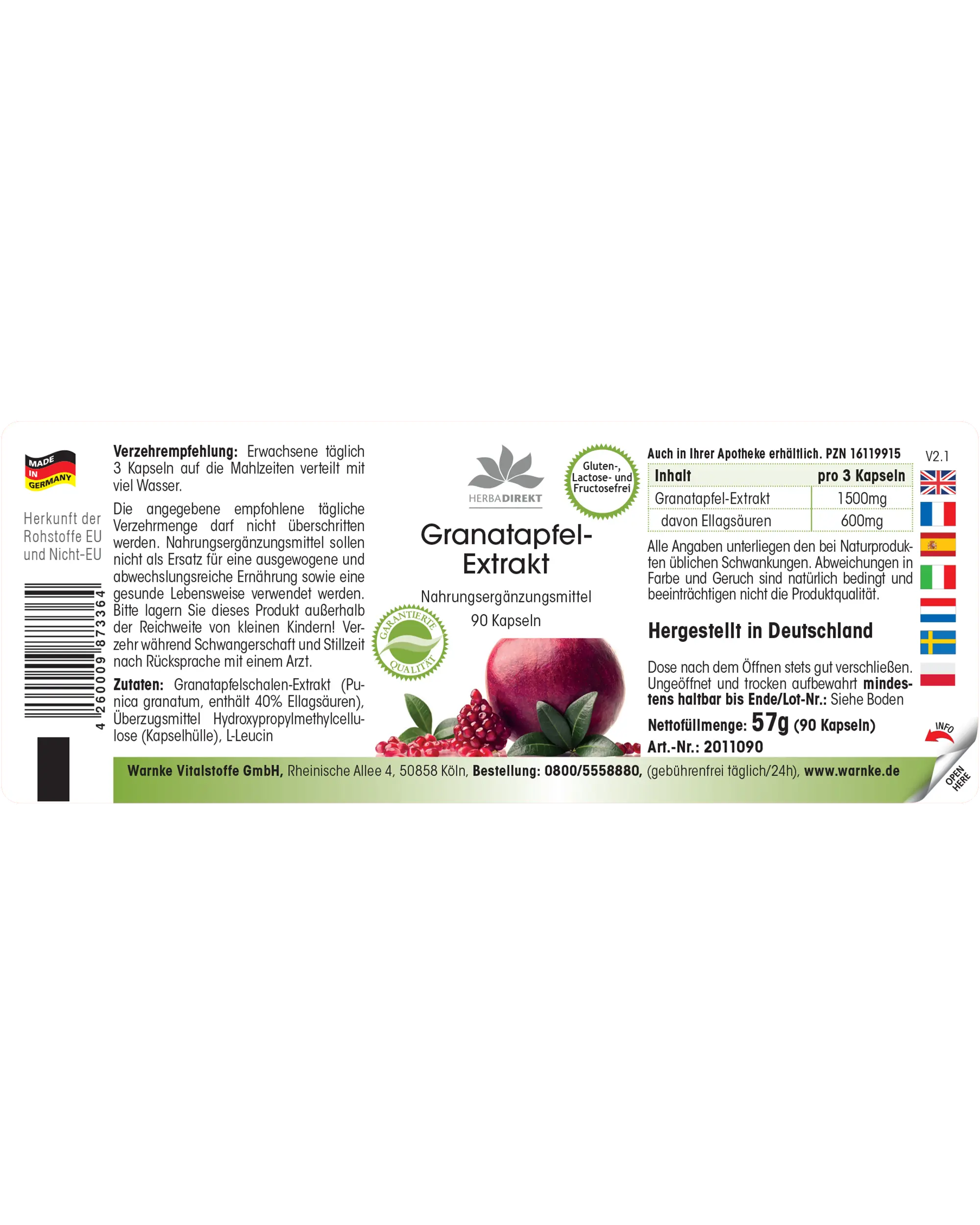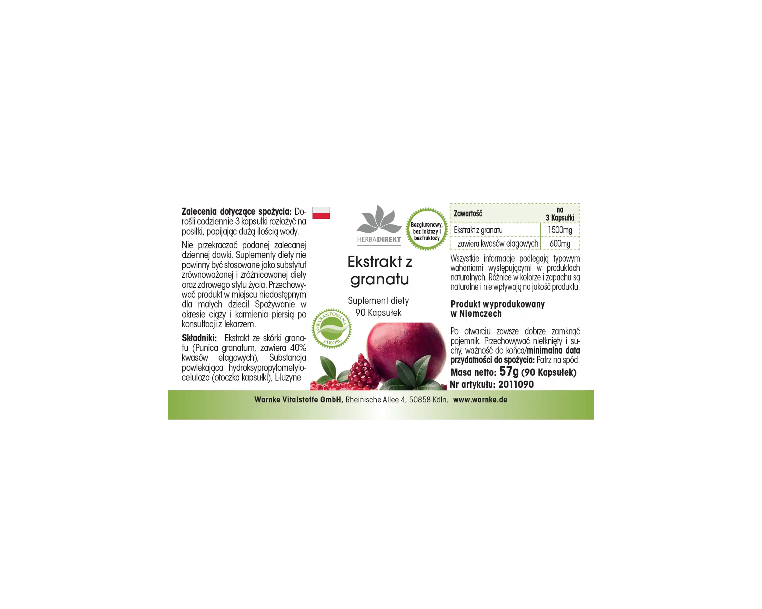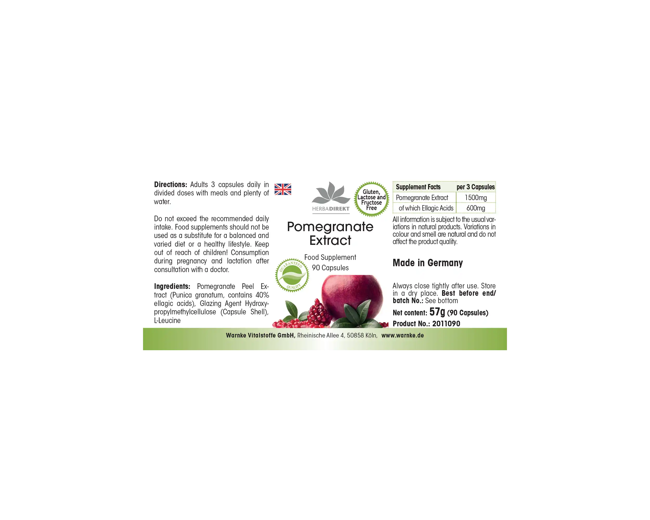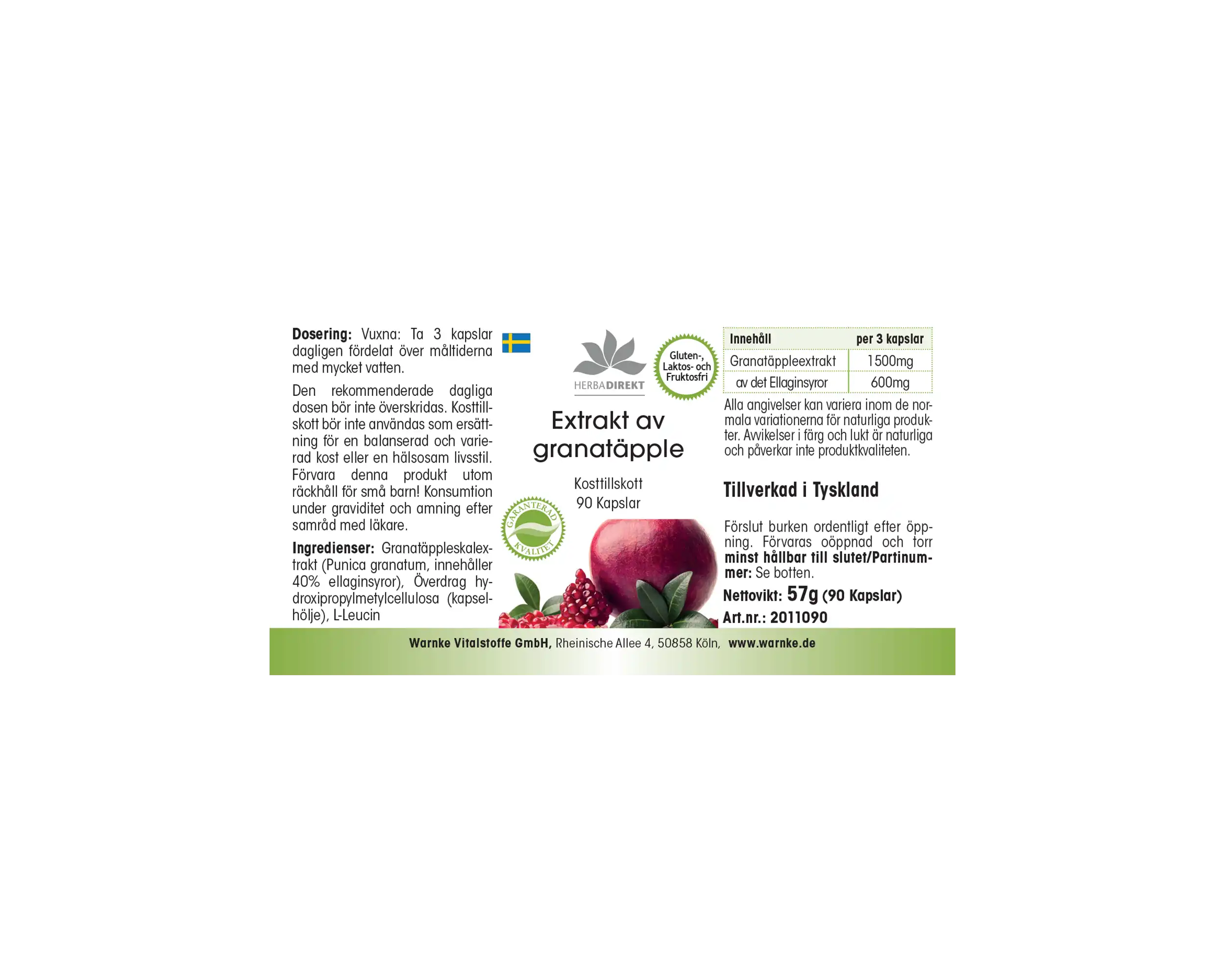 Warnke Vitalstoffe produce l’estratto di melograno in Germania secondo rigorose linee guida HACCP. Le capsule vegane non contengono additivi né coloranti e sono dotate di un pratico tappo dosatore a ribalta che consente un utilizzo semplice e igienico.
