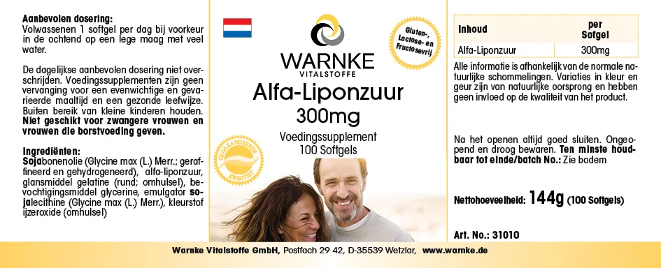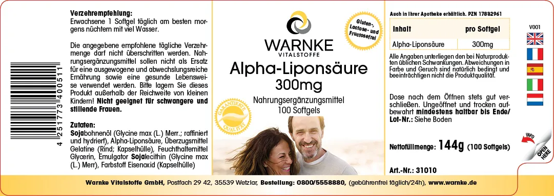 Sojaolie (Glycine max (L.) Merr.; geraffineerd en gehydrogeneerd), alfa-liponzuur, omhullingsmiddel gelatine (rund; capsuleomhulsel), bevochtigingsmiddel glycerine, emulgator sojalecithine (Glycine max (L.) Merr), kleurstof ijzeroxide (capsuleomhulsel)Aanbevolen consumptie