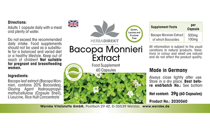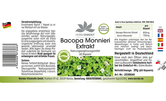 | Bacopa Monnieri Extrakt / Bacopa Monnieri Extract/ Extrait de Bacopa Monnieri / Estratto di Bacopa Monnieri | 500mg |