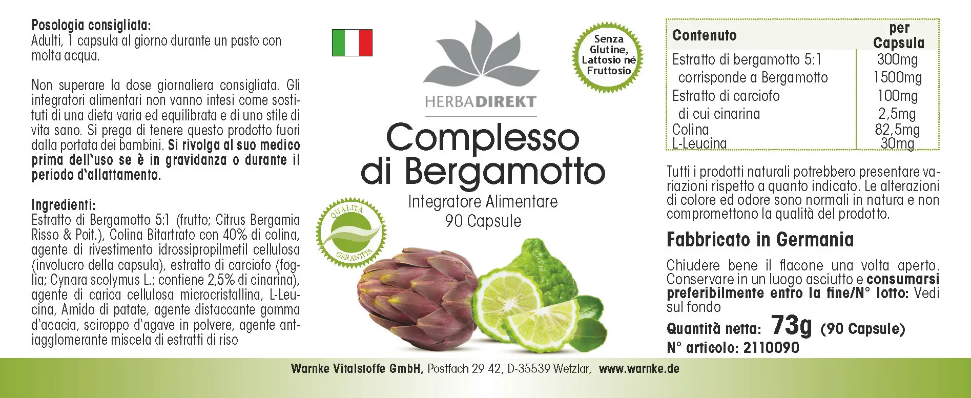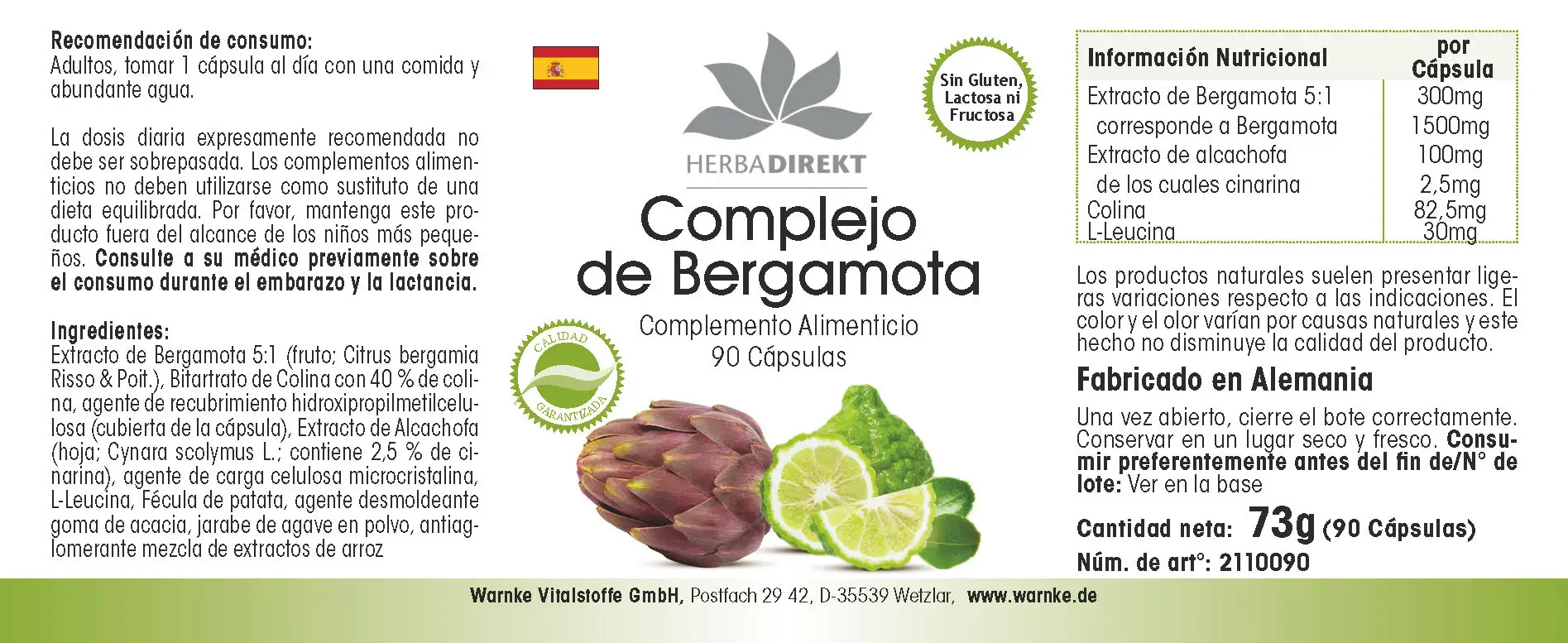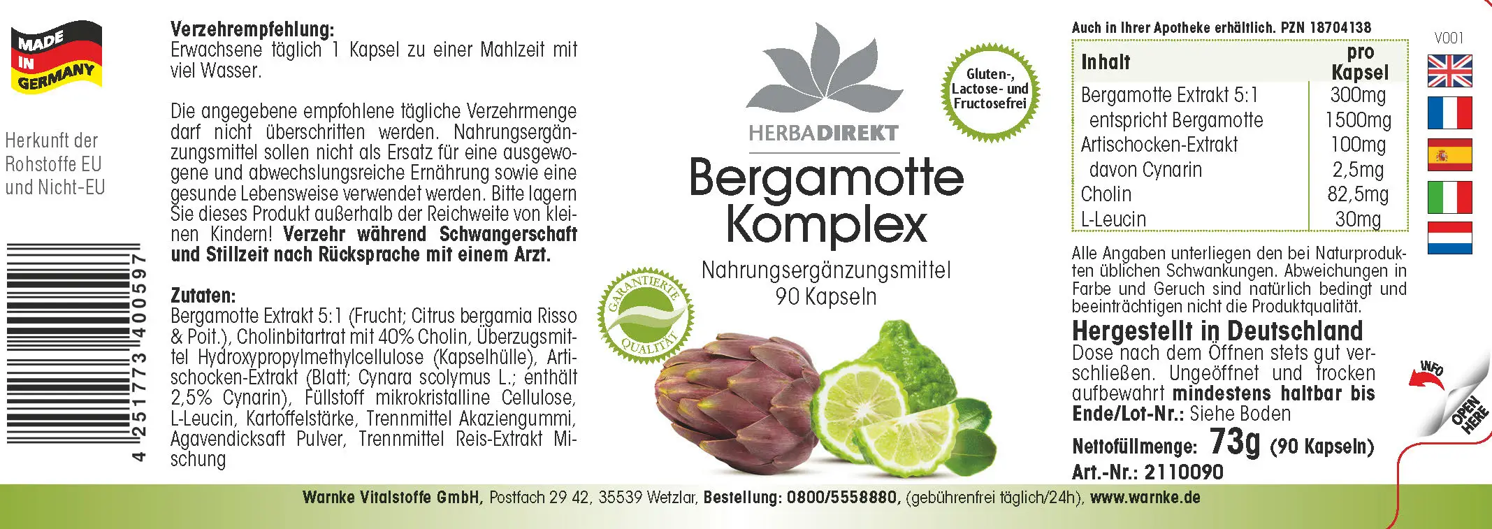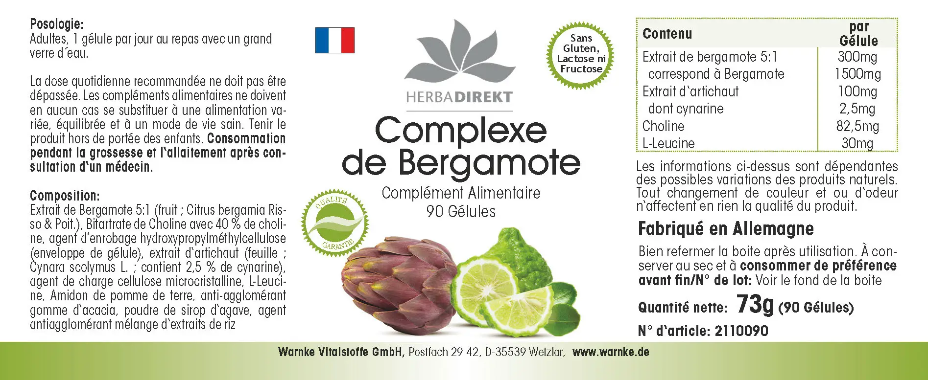 Bergamot-extract 5:1 (fruit; Citrus bergamia Risso & Poit.), cholinebitartraat met 40% choline, glansmiddel hydroxypropylmethylcellulose (capsuleomhulsel), artisjokextract (blad; Cynara scolymus L.; bevat 2,5% cynarine) , vulstof microkristallijne cellulose, L-leucine, aardappelzetmeel, lossingsmiddel acaciagom, agavesirooppoeder, lossingsmiddel rijstextractmengsel