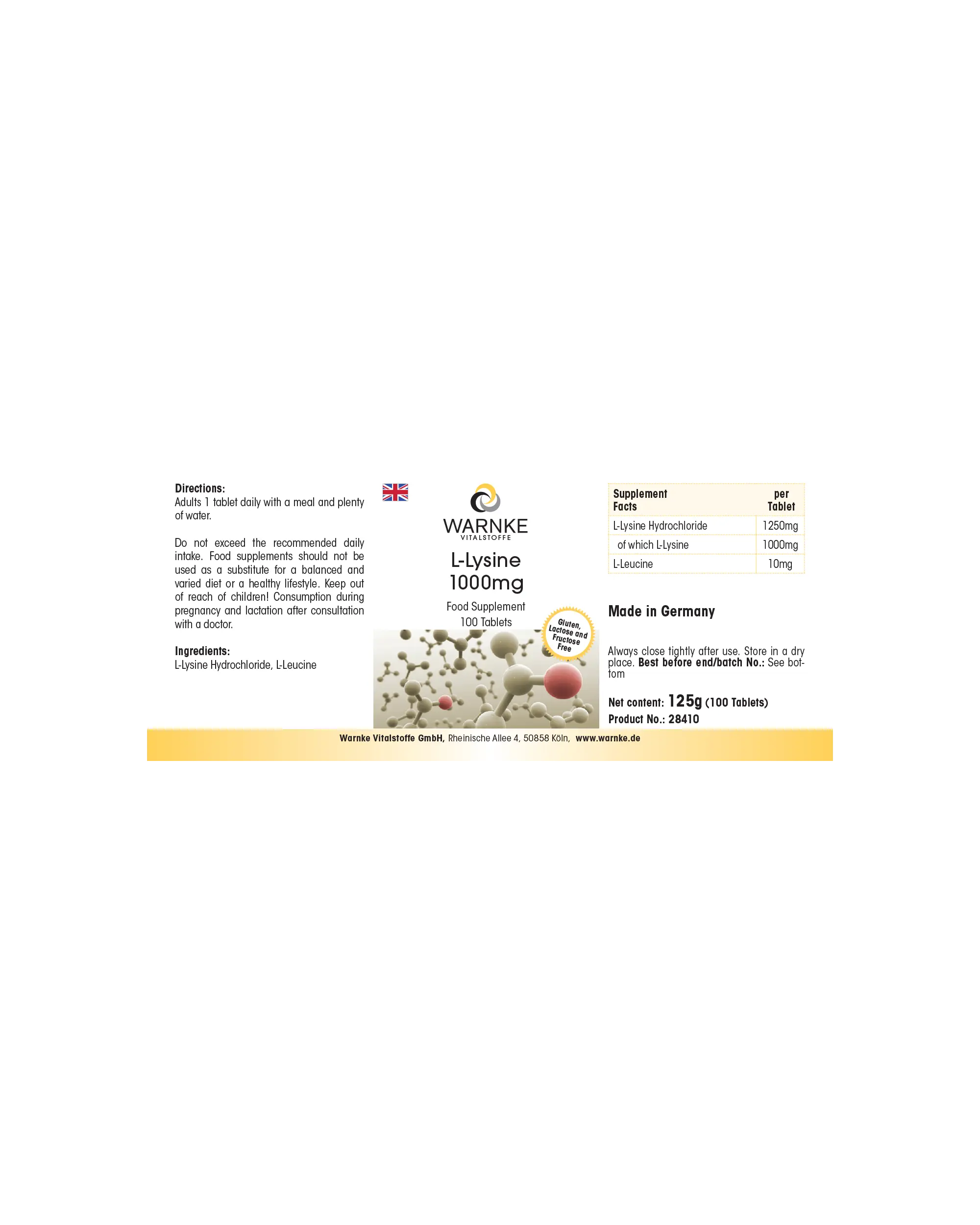 | L-Lysin Hydrochlorid / L-Lysine hydrochloride / Chlorhydrate de L-lysine / L-lisina clorhidrato / L-lisina cloridrato / L-lysinehydrochloride | 1250mg |