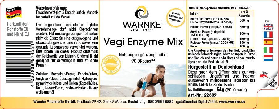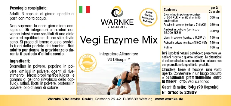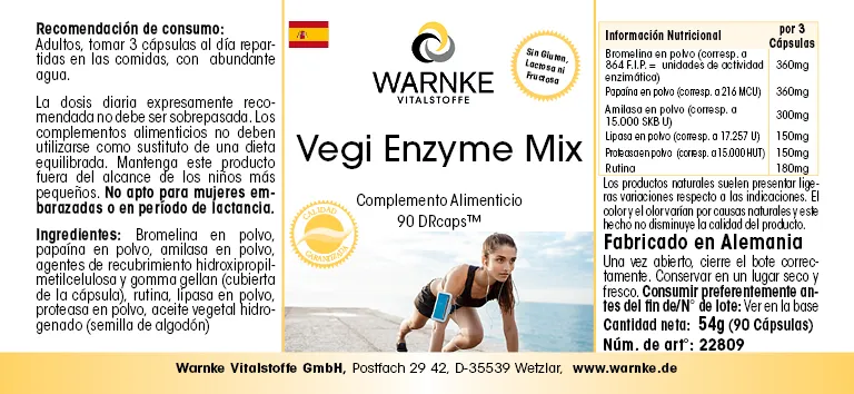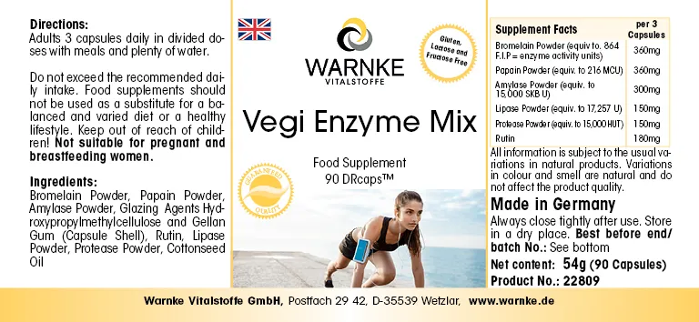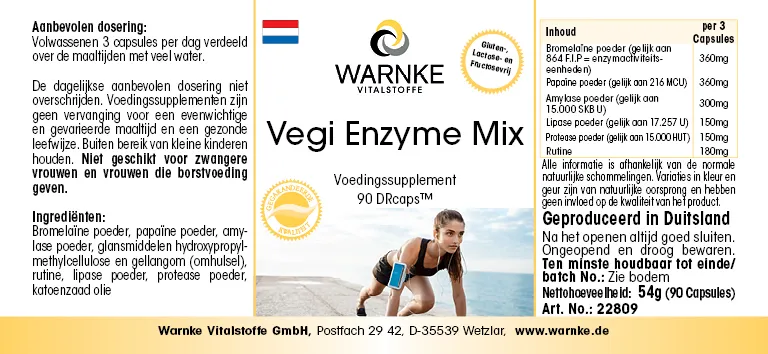 Bromelaïnepoeder, papaïnepoeder, amylasepoeder, coatingagent hydroxypropylmethylcellulose (capsulehuls), coatingagent gellan (capsulehuls), rutine, lipasepoeder, proteïnepoeder, scheidingsagent magnesiumzouten van vetzuren.