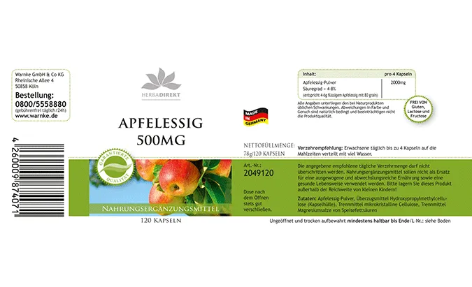 Produktinformationen "Apfelessig 500mg - 120 Kapseln - Hochdosiert & Vegan | Warnke Vitalstoffe"