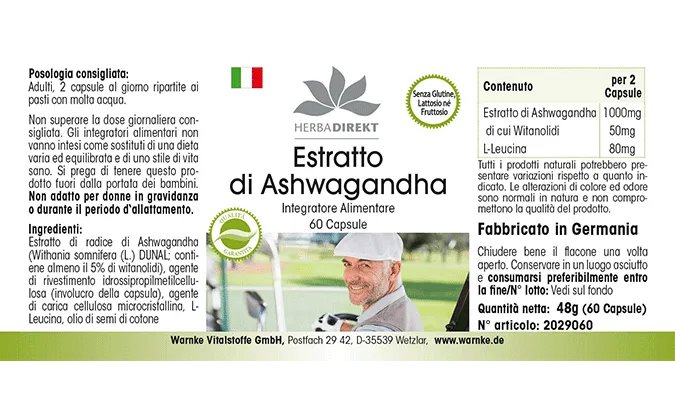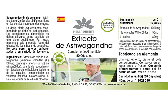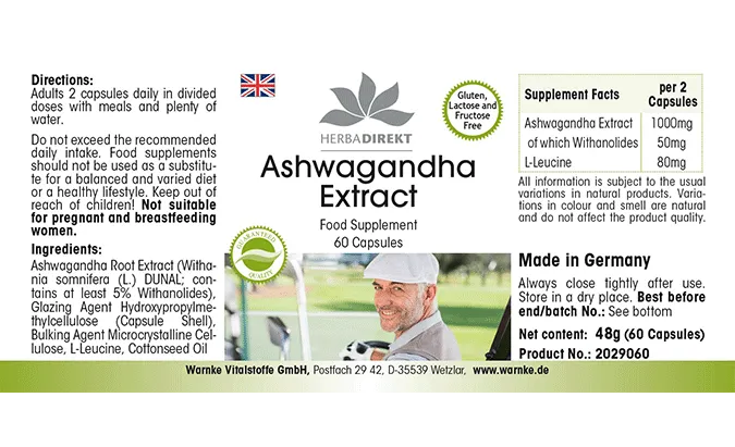 Ashwagandha-Extrakt 500mg enthält hochwertiges Ashwagandha-Extrakt (Withania somnifera), das mindestens 5% Withanolide umfasst. Dieses pflanzliche Extrakt wird häufig in der traditionellen Medizin verwendet. Die Kapseln sind mit mikrokristalliner Cellulose als Füllstoff sowie Hydroxypropylmethylcellulose für die Kapselhülle ergänzt. Zudem enthält das Produkt L-Leucin.