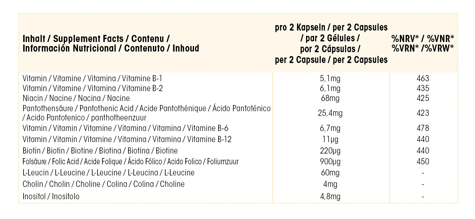 Hefeextrakt (Saccharomyces cerevisiae, enthält 8% B-Vitamine; Lynside® Forte B100), Überzugsmittel Hydroxypropylmethylcellulose (Kapselhülle), L-Leucin, Trennmittel Reis-Extrakt Mischung