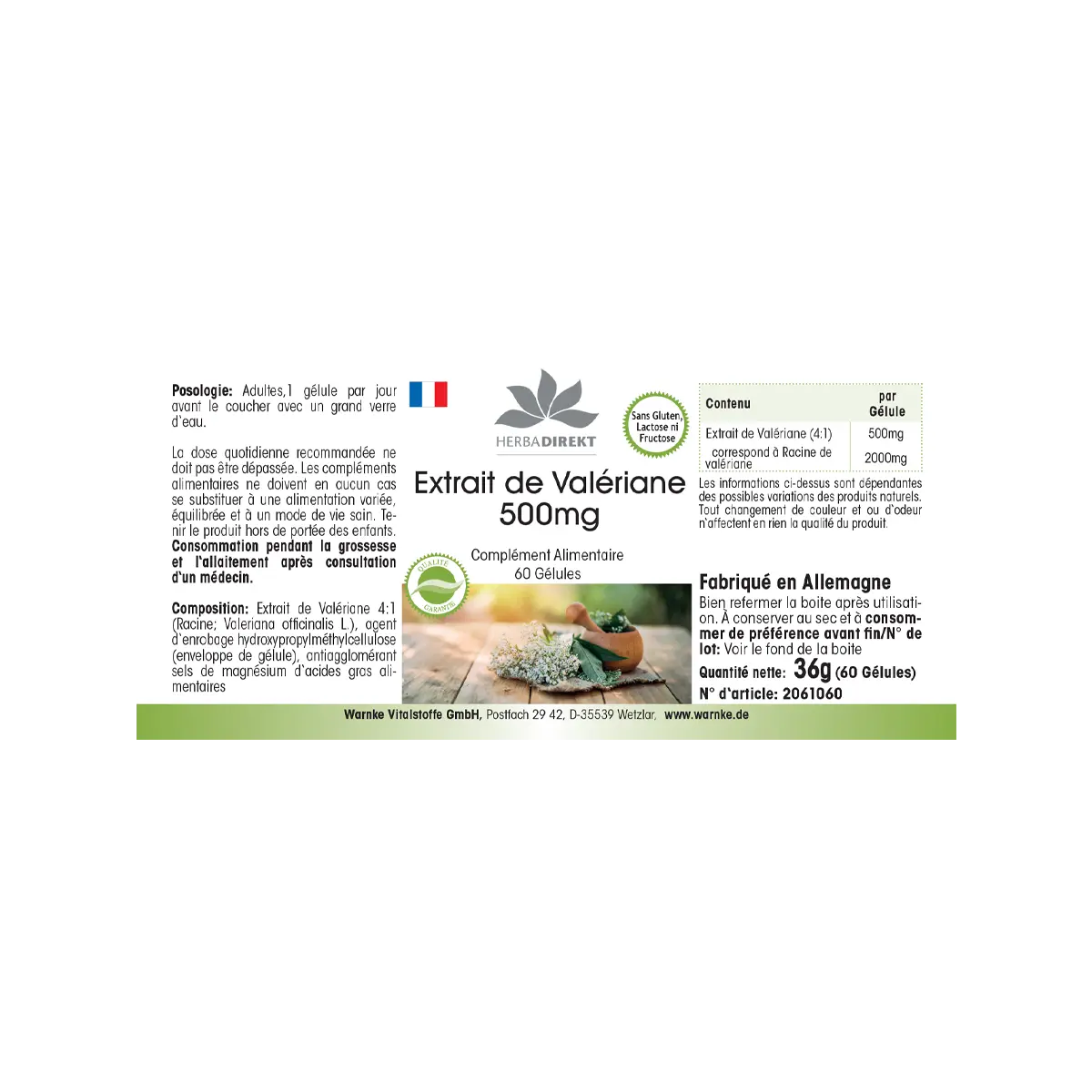 | Baldrian-Extrakt (4:1) / Valerian extract (4:1) / Extrait de Valériane (4:1) / Extracto de valeriana (4:1) / Estratto di valeriana (4:1) | 500mg |