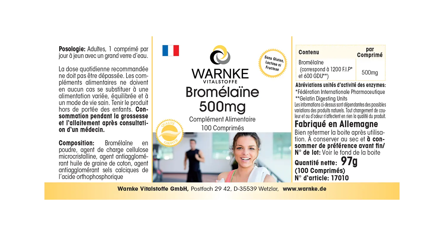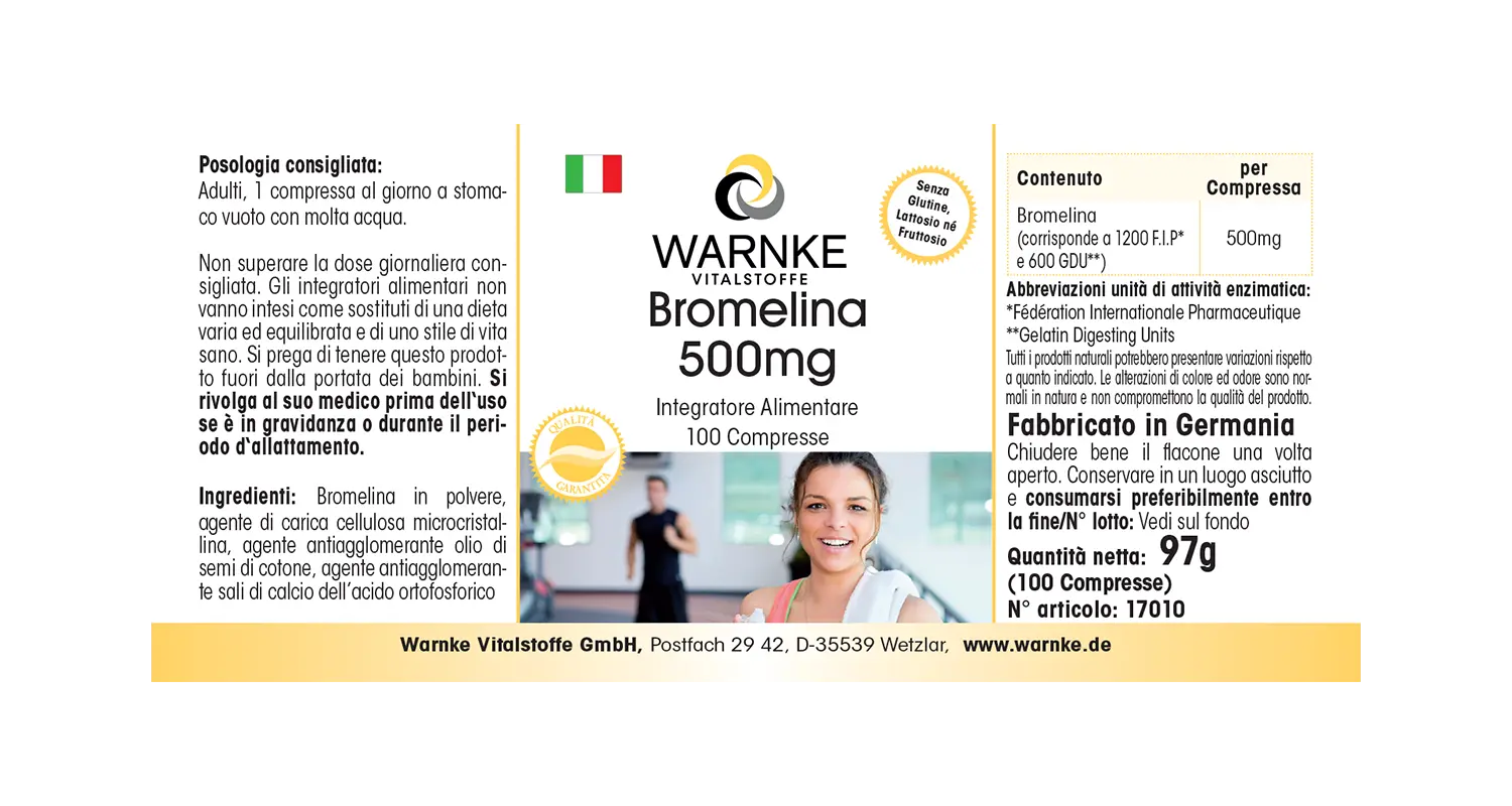Dieses Produkt enthält Bromelain-Pulver in einer Dosis von 500 mg pro Tablette, mit einer Aktivität von 1200 F.I.P. (Food Chemical Codex, FCC). Es ist mit mikrokristalliner Cellulose als Füllstoff und Baumwollsamenöl sowie Calciumsalzen der Orthophosphorsäure als Trennmittel formuliert.