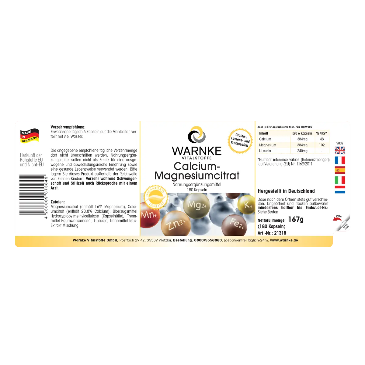 Calcium-Magnesiumcitrat - 180 Kapseln - für Knochen, Muskeln, Zähne uvm. | Warnke Vitalstoffe
