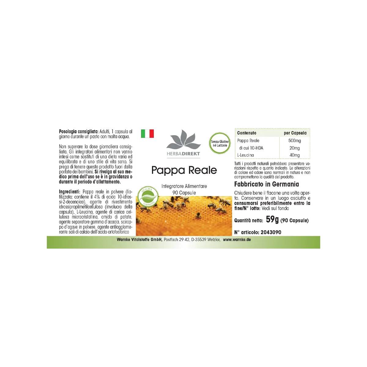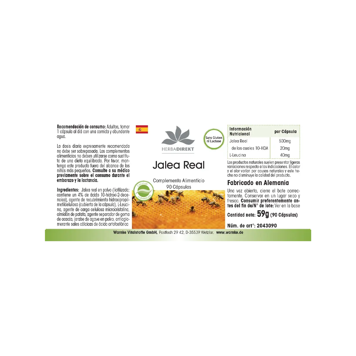 Gelée Royale Pulver (gefriergetrocknet; enthält 4% 10-Hydroxy-2-Decensäure), Überzugsmittel Hydroxypropylmethylcellulose (Kapselhülle), L-Leucin, Füllstoff mikrokristalline Cellulose, Kartoffelstärke, Trennmittel Akaziengummi, Agavendicksaft Pulver, Trennmittel Calciumsalze der Orthophosphorsäure