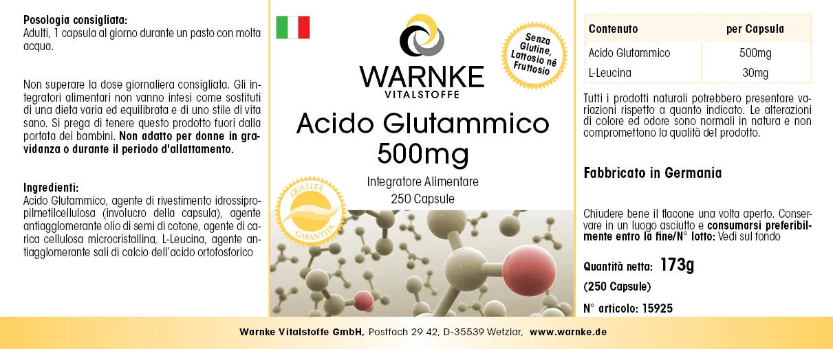 Produktinformationen "Glutaminsäure 500mg - 250 Kapseln - Hochdosiert & Vegan | Warnke Vitalstoffe"