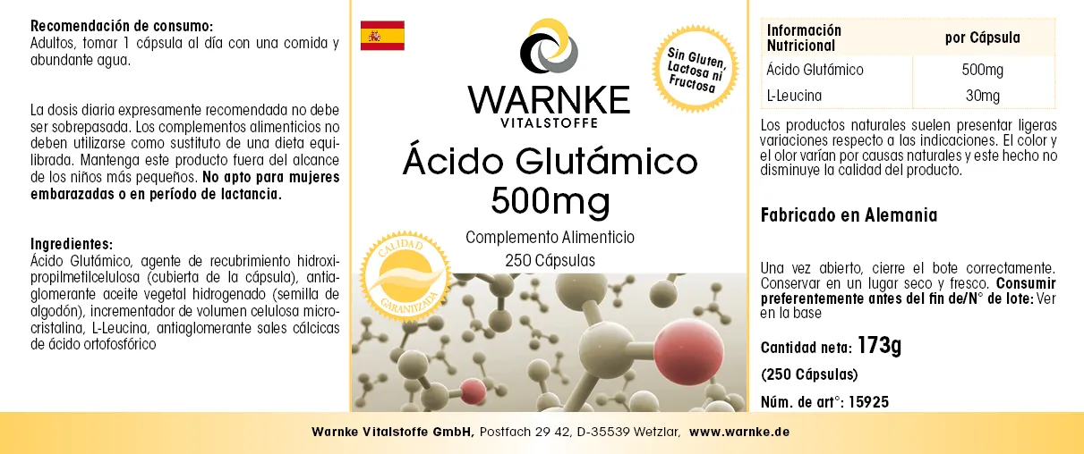 Glutaminsäure 500mg - 250 Kapseln - Hochdosiert & Vegan | Warnke Vitalstoffe