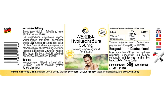 Produktinformationen "Hyaluronsäure 350mg - 100 Tabletten - Hochdosiert & Vegan | Warnke Vitalstoffe"
