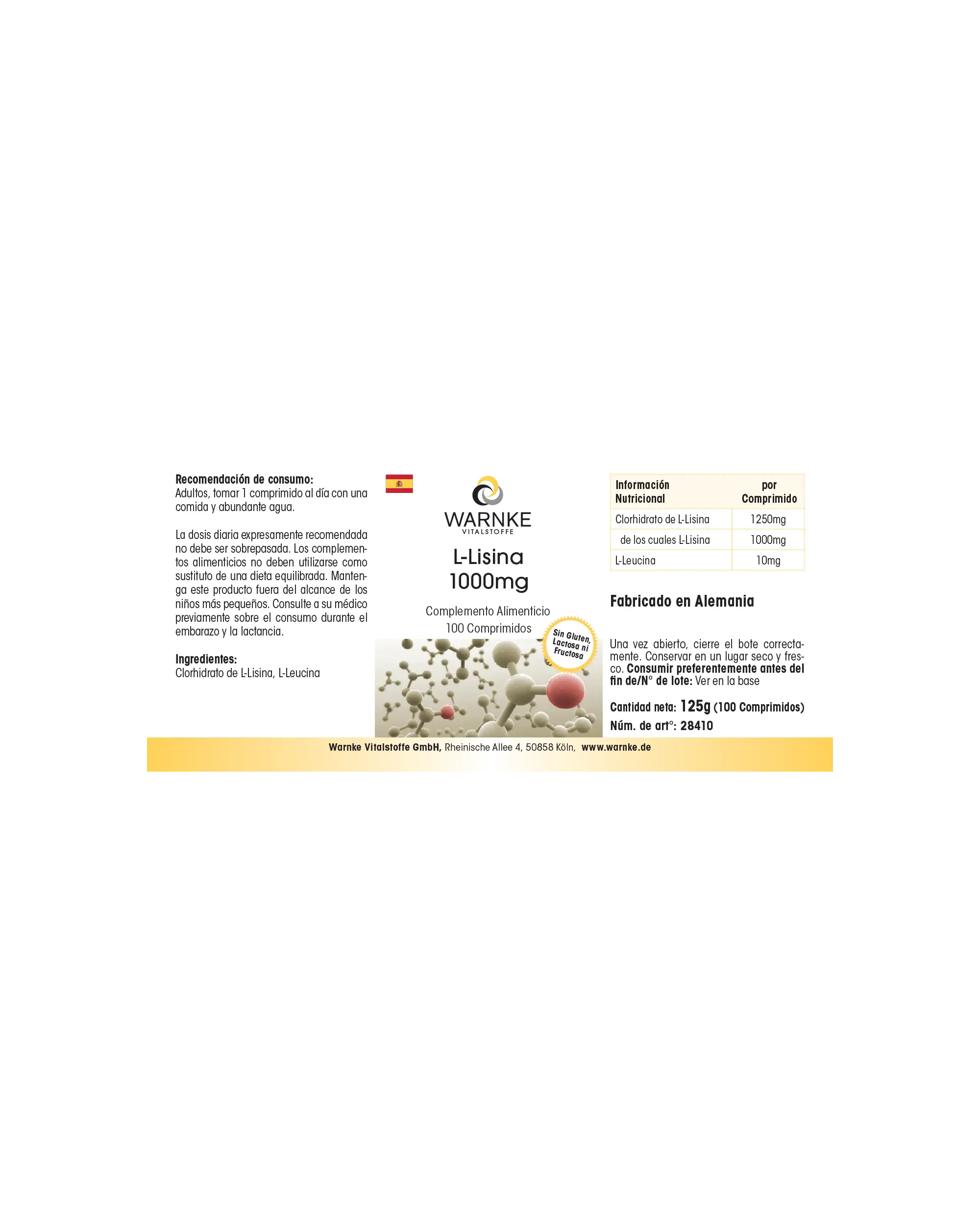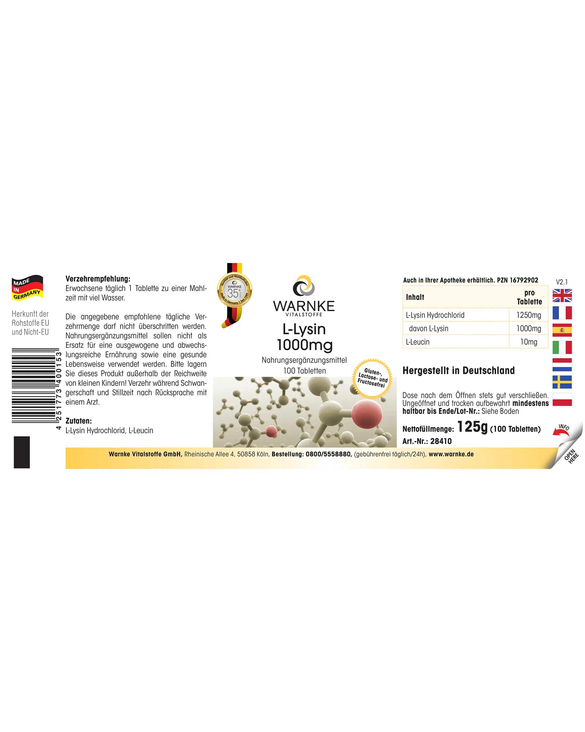 Produktinformationen "L-Lysin 1000mg - 100 Tabletten - Vegan | Warnke Vitalstoffe"