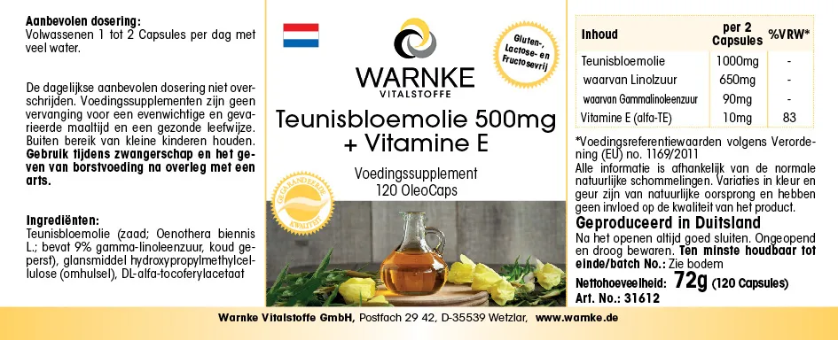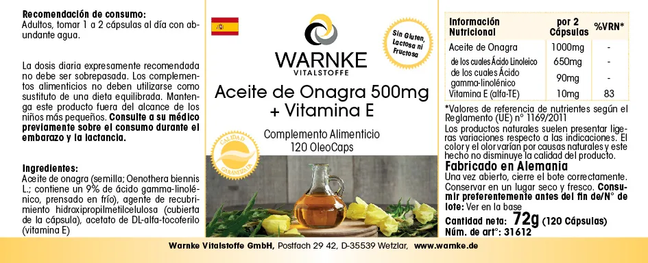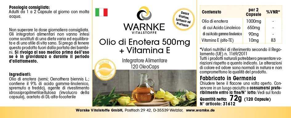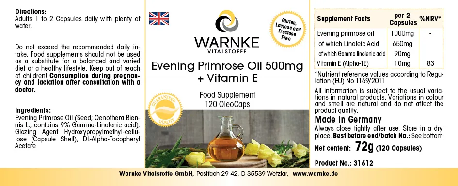 Produktinformationen "Nachtkerzenöl 500mg + Vitamin E - 120 OleoCaps - für Zellschutz - Vegan | Warnke Vitalstoffe"