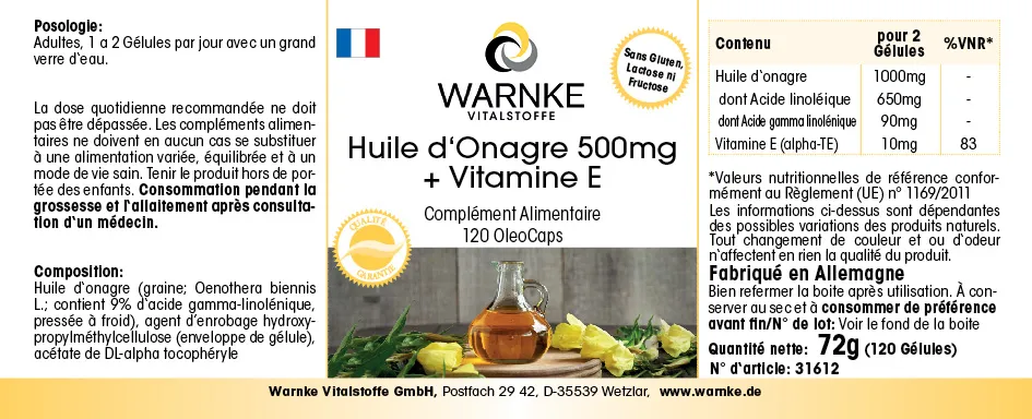 Nachtkerzenöl 500mg + Vitamin E enthält Nachtkerzenöl aus den Samen der Oenothera biennis L. Pflanze, das 9% Gamma-Linolensäure enthält und durch kalt pressen gewonnen wird.