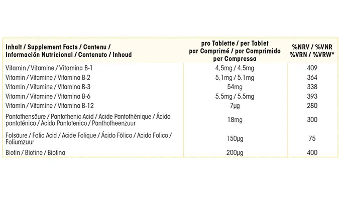 Füllstoff mikrokristalline Cellulose, Nicotinamid, Calcium-D-pantothenat, Reisstärke, Methylcobalamin, Pyridoxin-HCL, Thiaminmononitrat, Riboflavin, D-Biotin, Pteroylmonoglutaminsäure