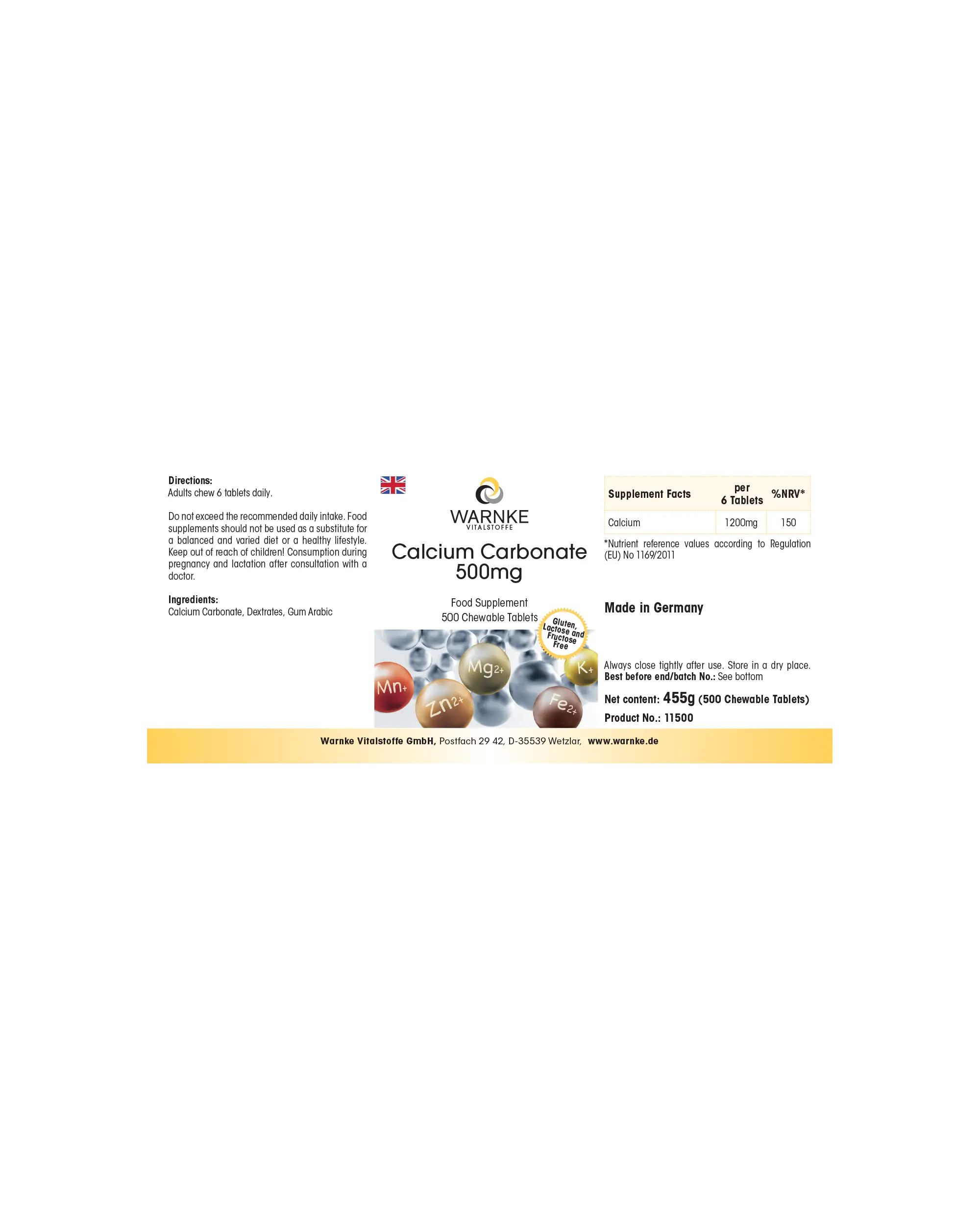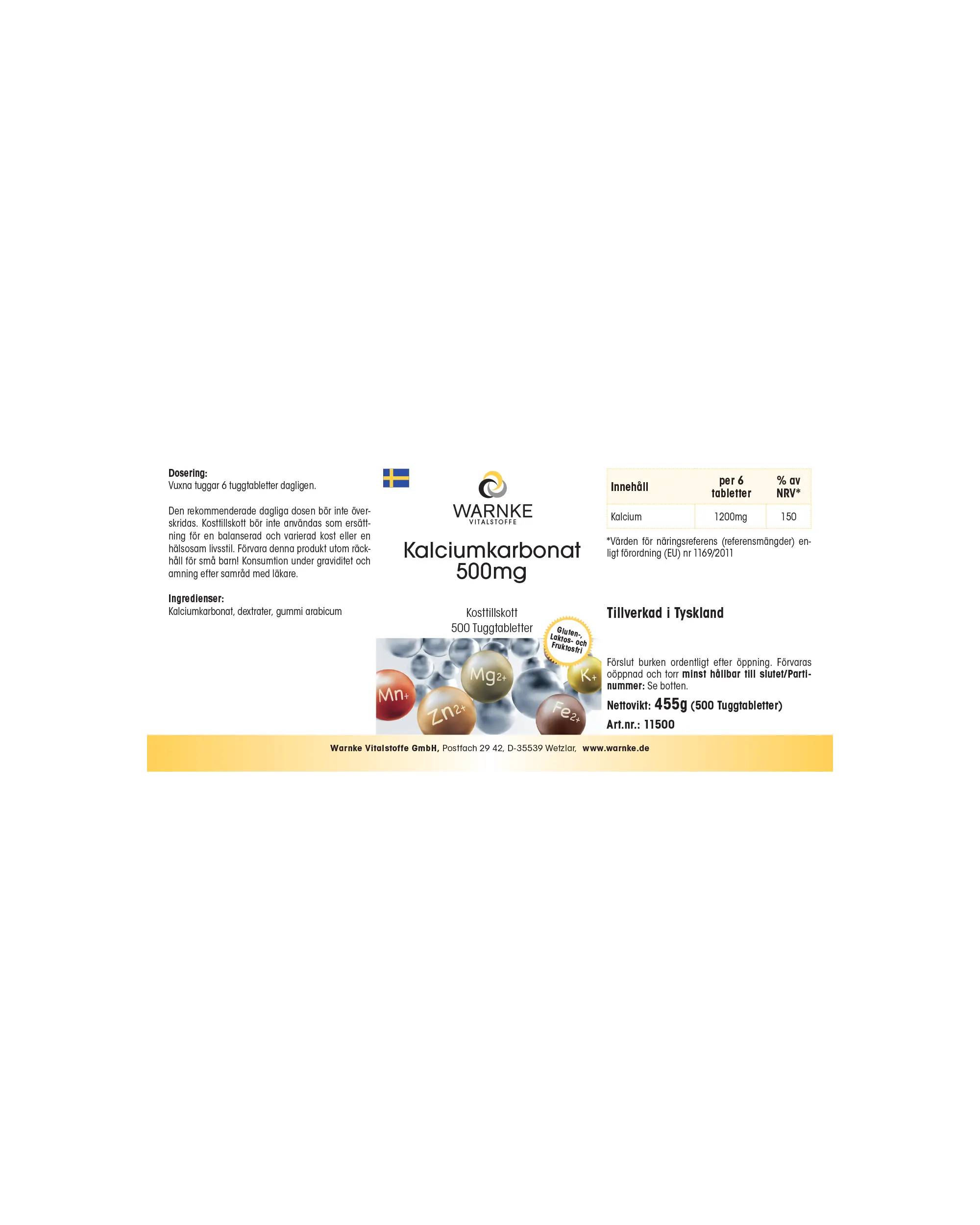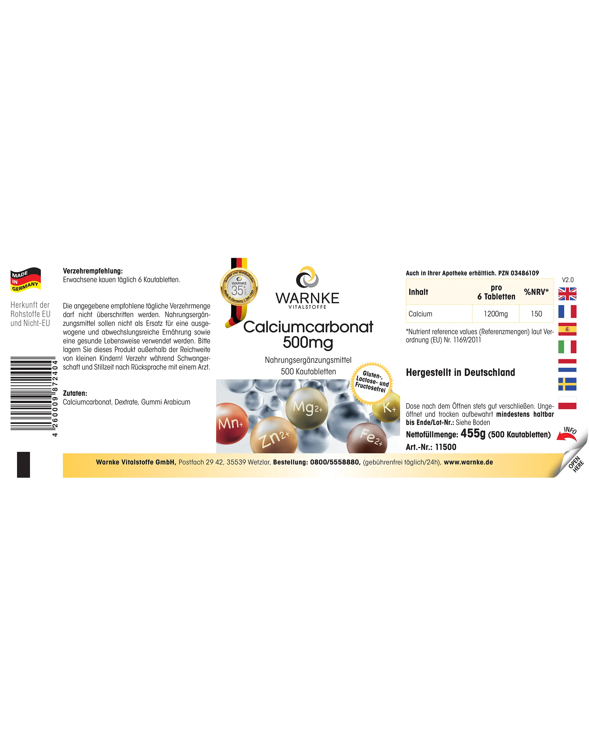 Carbonato cálcico 500 mg: un complemento alimenticio vegano de alta calidad fabricado en Alemania que ofrece una forma sencilla de complementar la alimentación diaria de forma específica. Confíe en la pureza y la calidad de Warnke Vitalstoffe.
