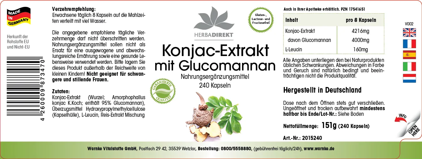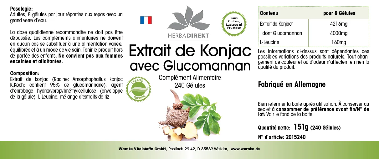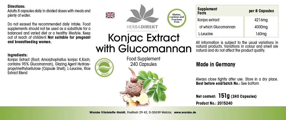 - Konjakwurzel Extrakt: Bekannt für seinen natürlichen Ballaststoff Glucomannan, der häufig in Produkten zur Ernährungsergänzung eingesetzt
