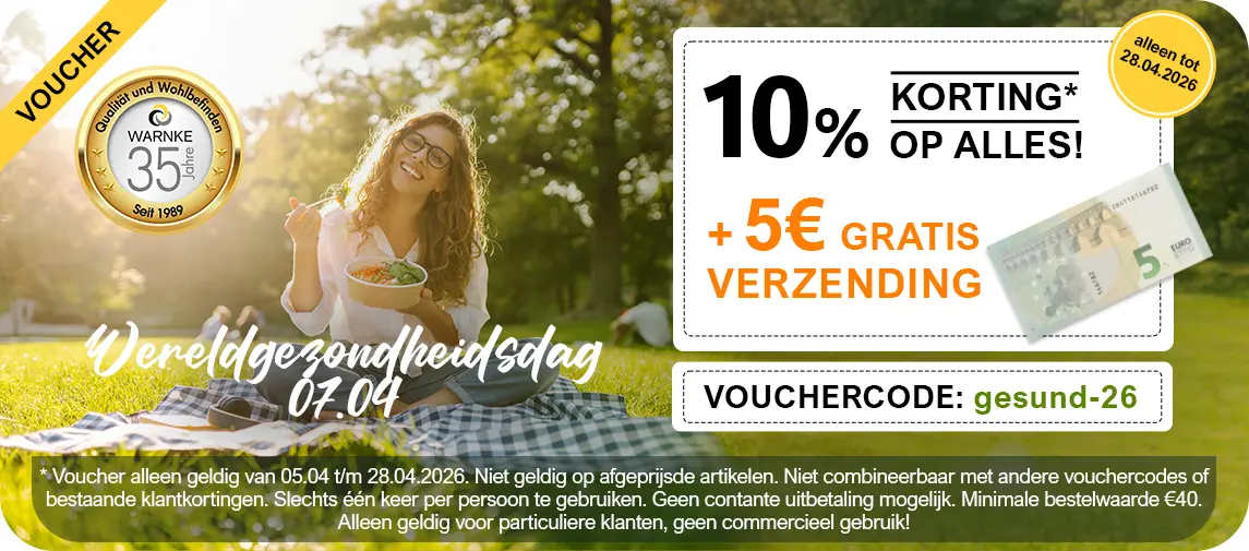 * Voucher alleen geldig van 05.04 t/m 28.04.2026. Niet geldig op afgeprijsde artikelen. Niet combineerbaar met andere vouchercodes of bestaande klantkortingen. Slechts één keer per persoon te gebruiken. Geen contante uitbetaling mogelijk. Minimale bestelwaarde €40. Alleen geldig voor particuliere klanten, geen commercieel gebruik!