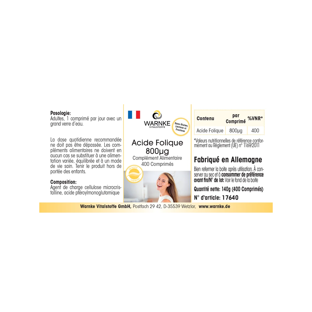 De foliumzuurtabletten van Warnke Vitalstoffe bieden een hoogwaardige aanvulling op de dagelijkse voeding. Met 800 µg foliumzuur per tablet bevat dit product vier keer de aanbevolen dagelijkse hoeveelheid (400% ADH). De tabletten zijn vrij van gluten, lactose en fructose, waardoor ze geschikt zijn voor mensen met speciale dieetvereisten.